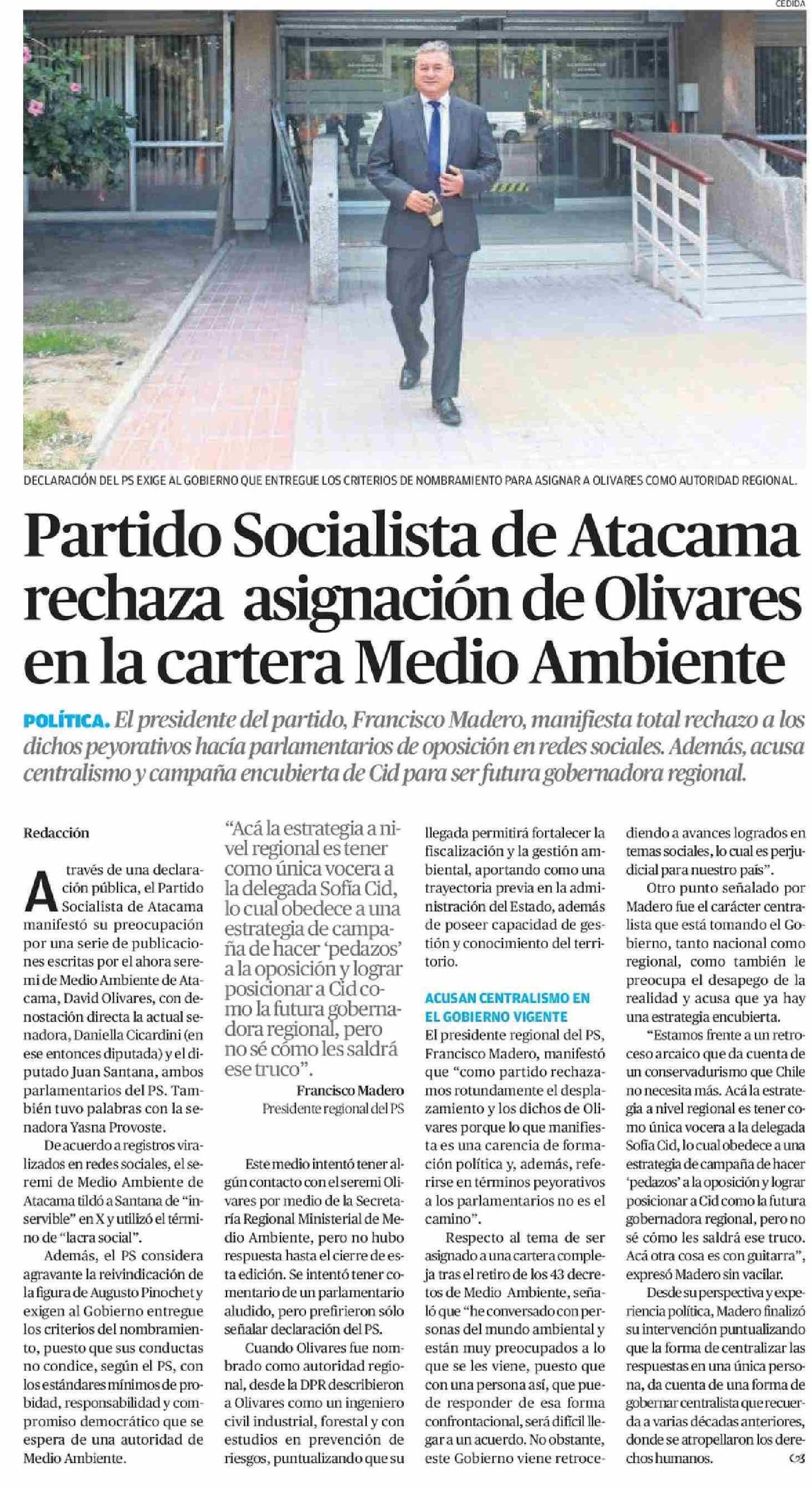| Título: | Partido Socialista de Atacama rechaza asignación de Olivares en la cartera Medio Ambiente |
