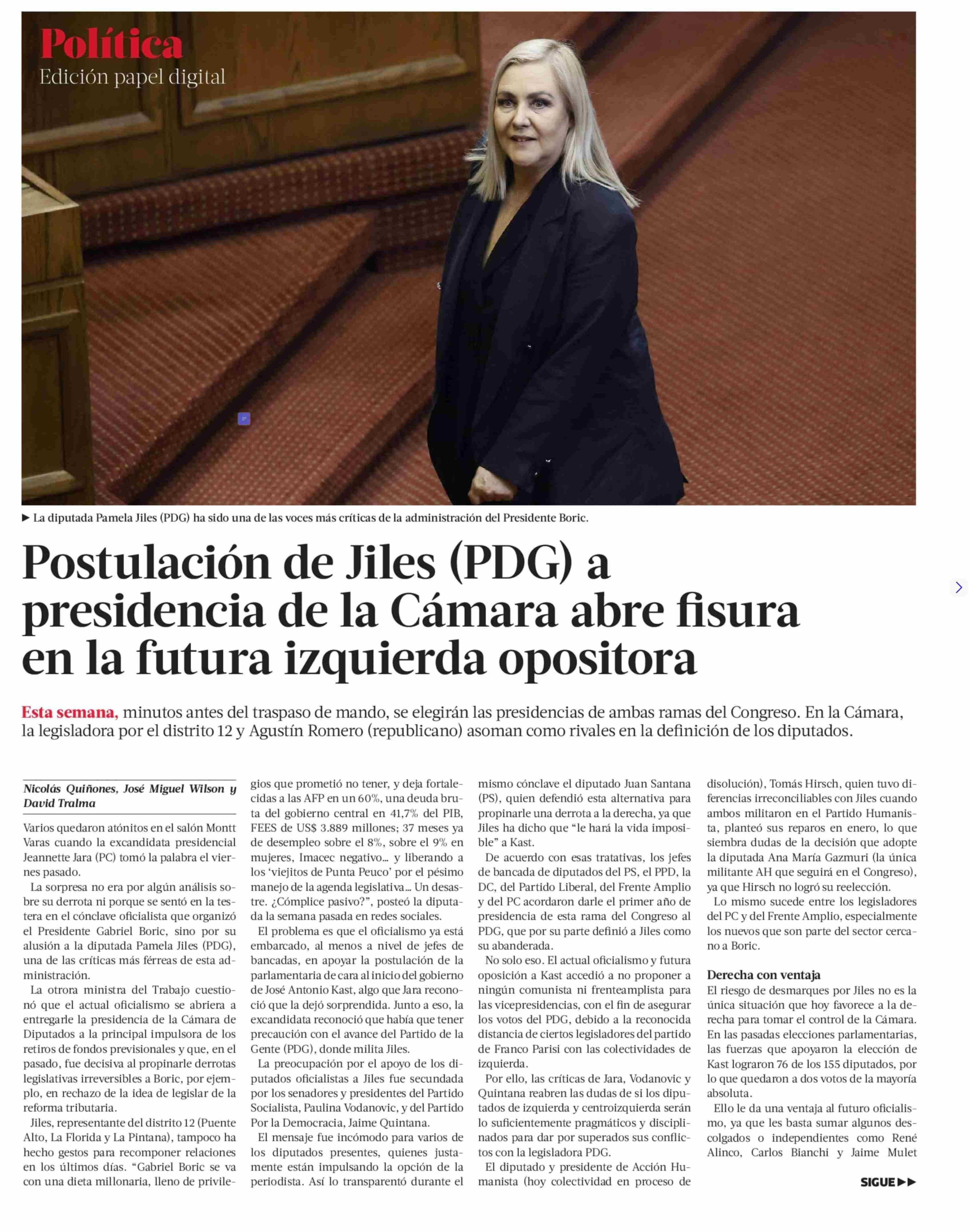 | Título: | Postulación de Jiles (PDG) a presidencia de la Cámara abre fisura en la futura izquierda opositora |
