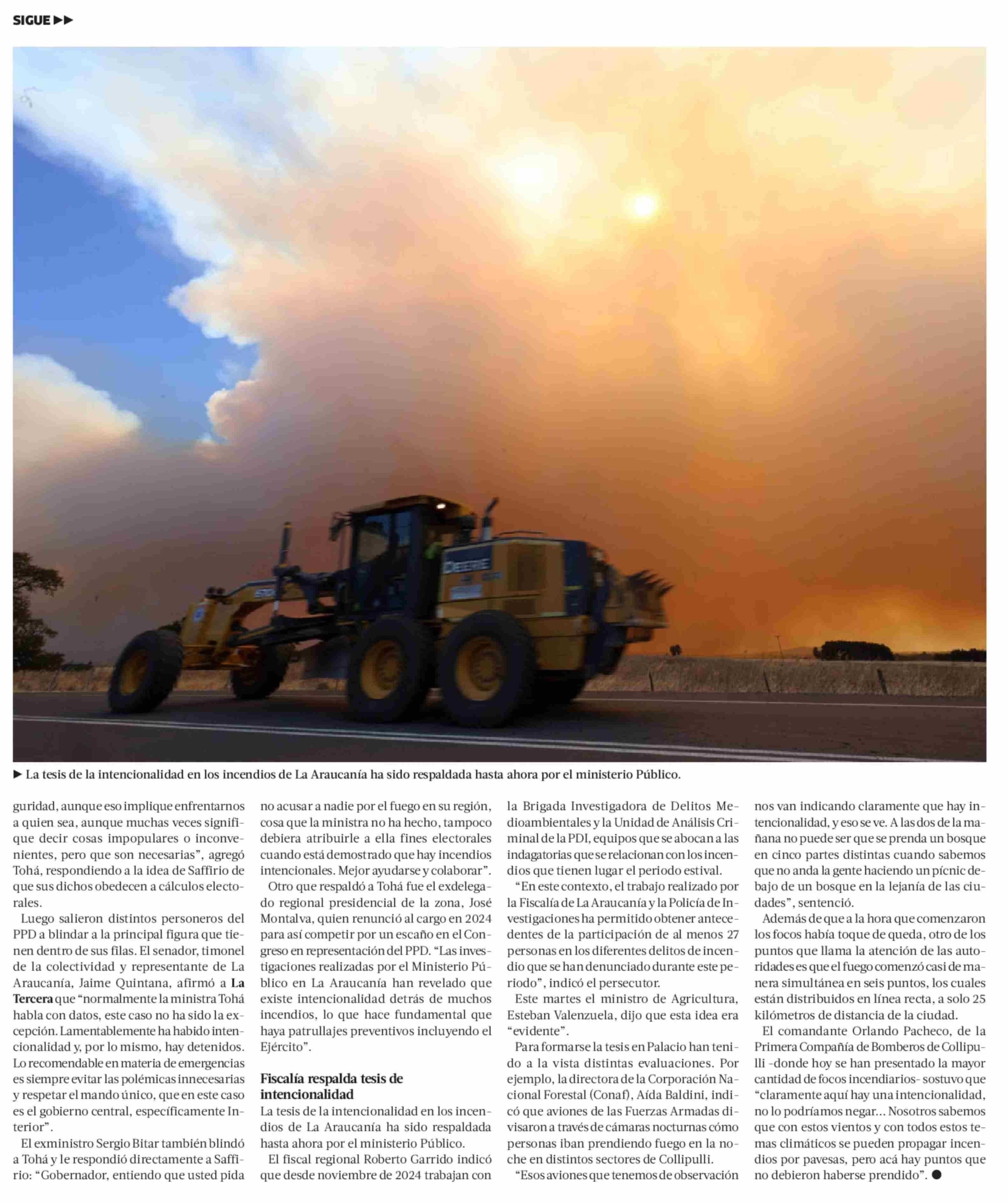 Tohá abre disputa oficialista al ligar incendios intencionados con "reivindicación" de tierras 12-02-2025 La Tercera |
