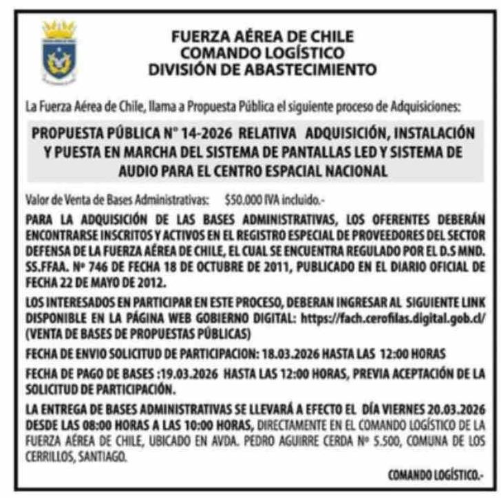 Aviso Licitaciones: FUERZA AÉREA DE CHILE COMANDO LOGÍSTICO DIVISIÓN DE ABASTECIMIENTO 17-03-2026 Las Últimas Noticias |