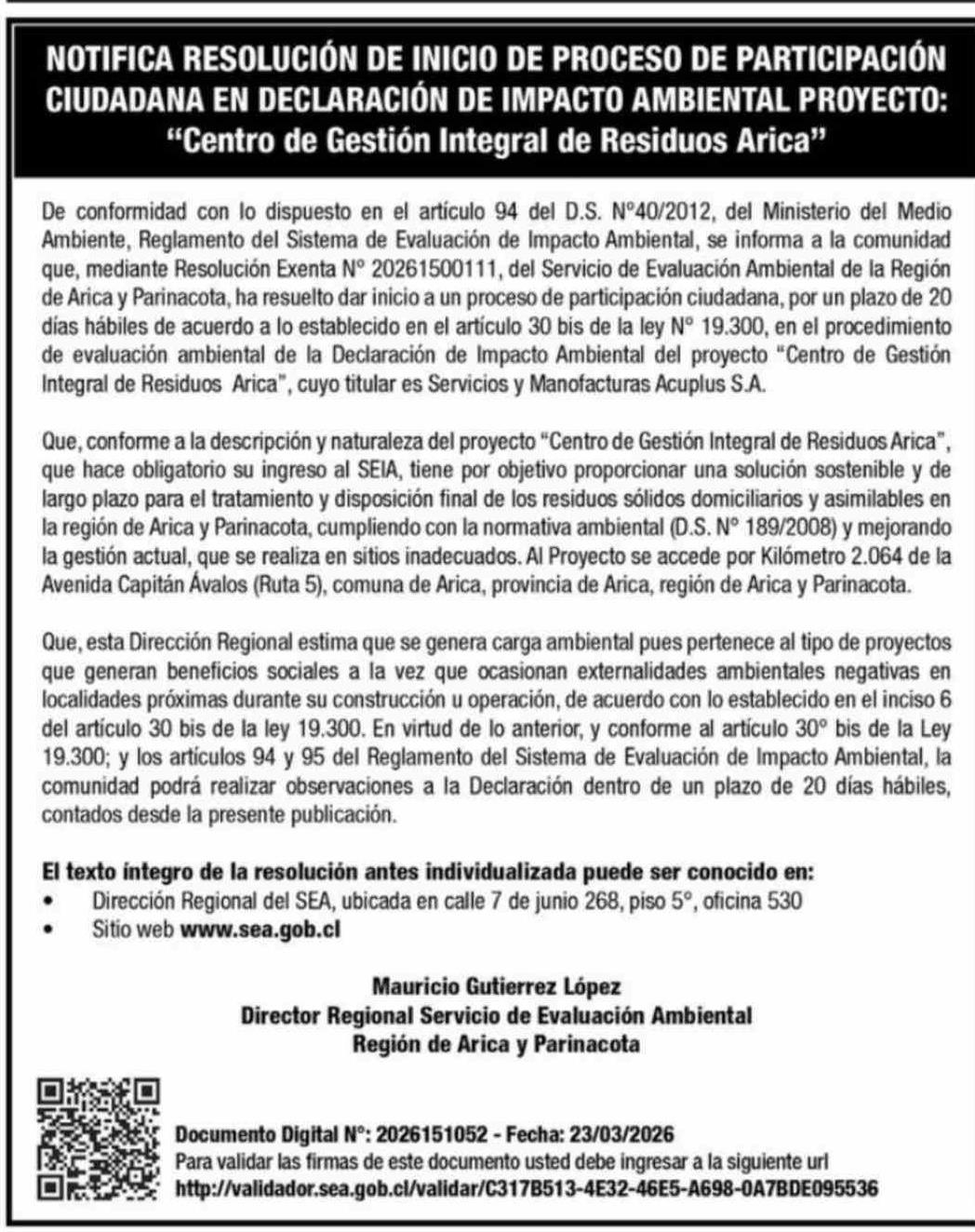 | Título: | Extractos: NOTIFICA RESOLUCIÓN DE INICIO DE PROCESO DE PARTICIPACIÓN CIUDADANA EN DECLARACIÓN DE IMPACTO AMBIENTAL PROYECTO: "Centro de Gestión Integral de Residuos Arica" |