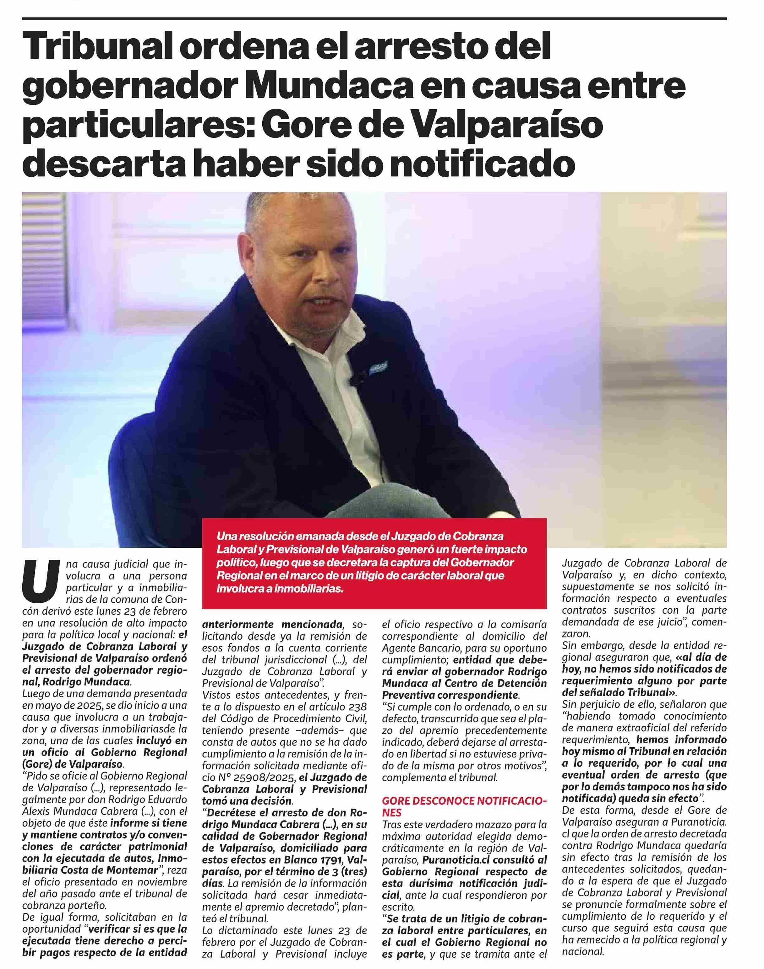 Tribunal ordena el arresto del gobernador Mundaca en causa entre particulares: Gore de Valparaíso descarta haber sido notificado 23-02-2026 Puranoticia.cl |