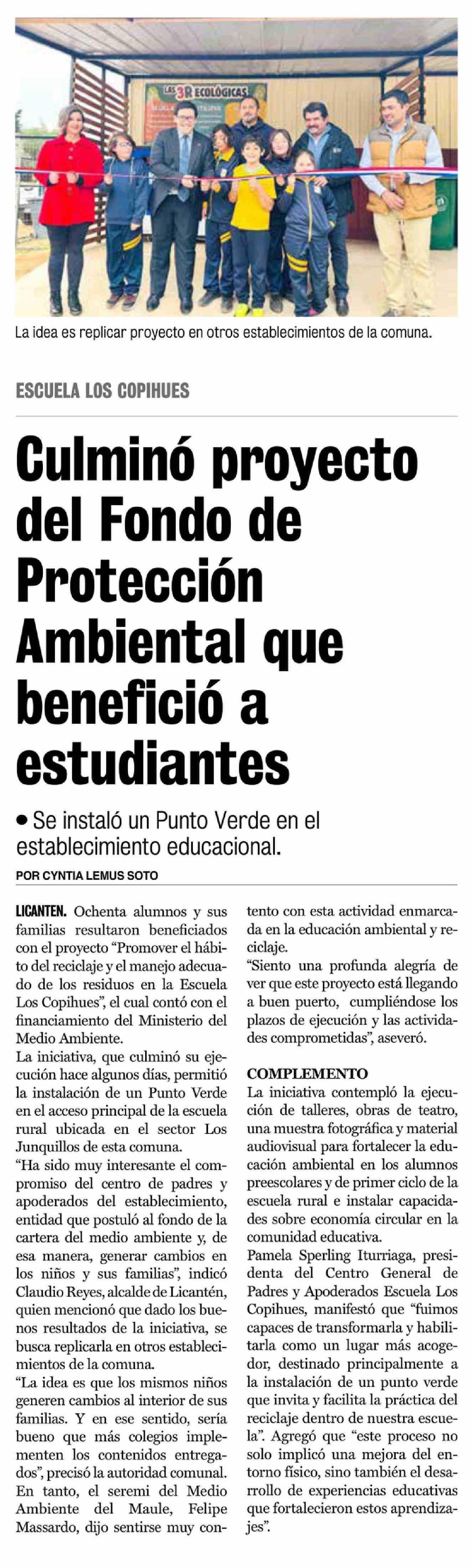 Culminó proyecto del Fondo de Protección Ambiental que benefició a estudiantes 18-04-2026 La Prensa de Curicó |