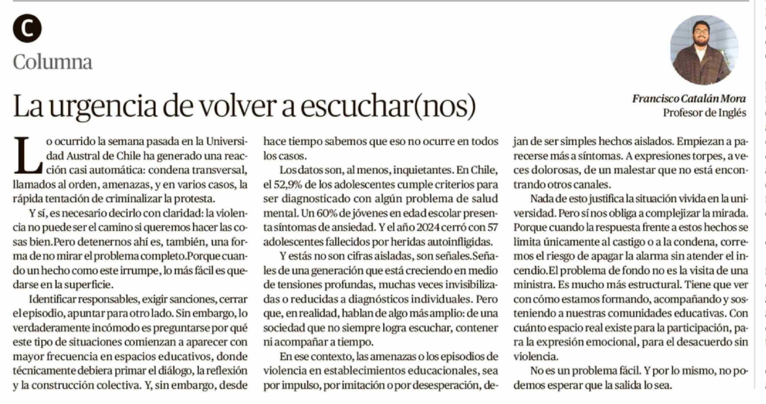 Columnas de Opinión: La urgencia de volver a escuchar(nos) 13-04-2026 Diario Austral Región de Los Ríos |