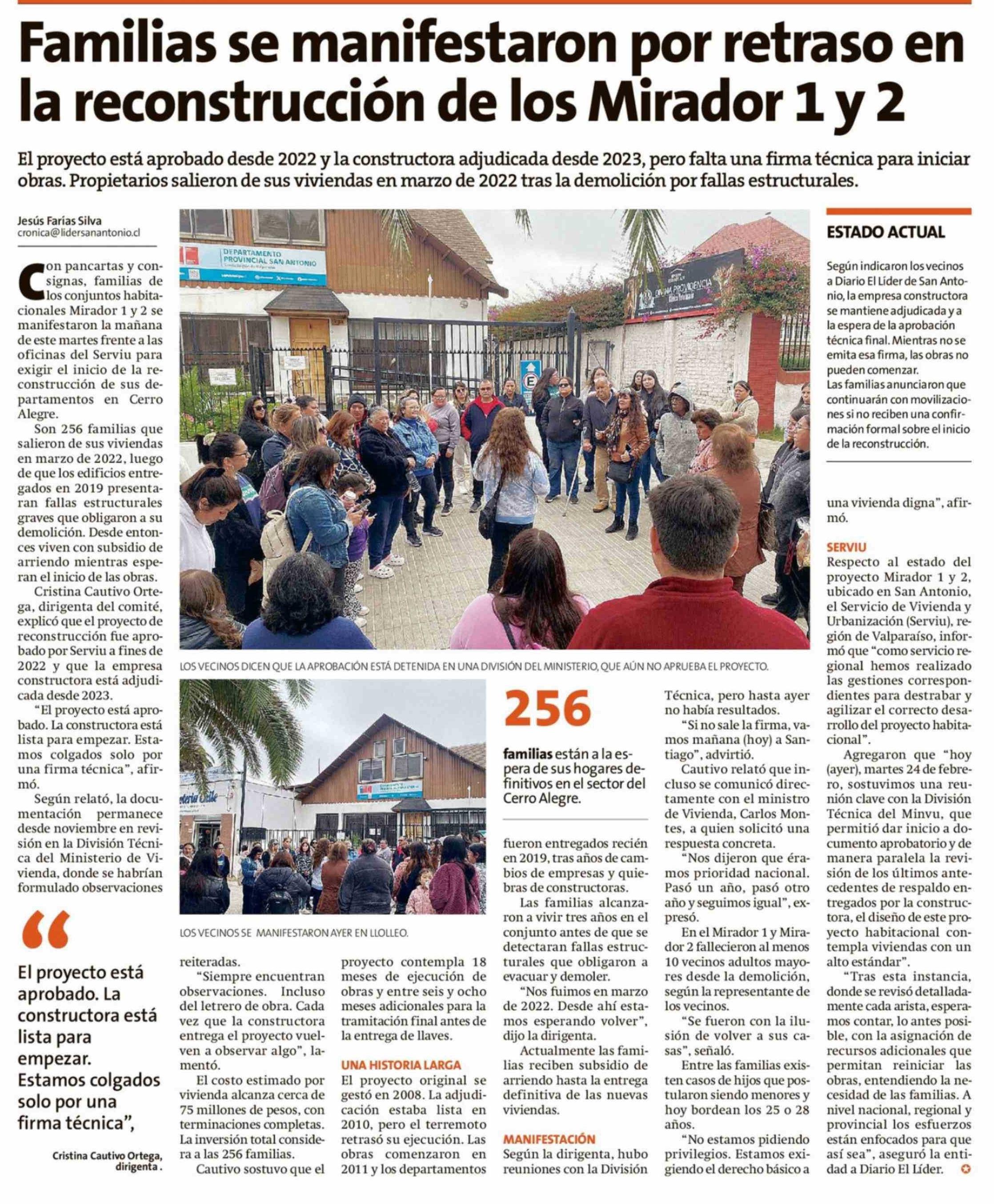 Familias se manifestaron por retraso en la reconstrucción de los Mirador 1 y 2 25-02-2026 El Líder |