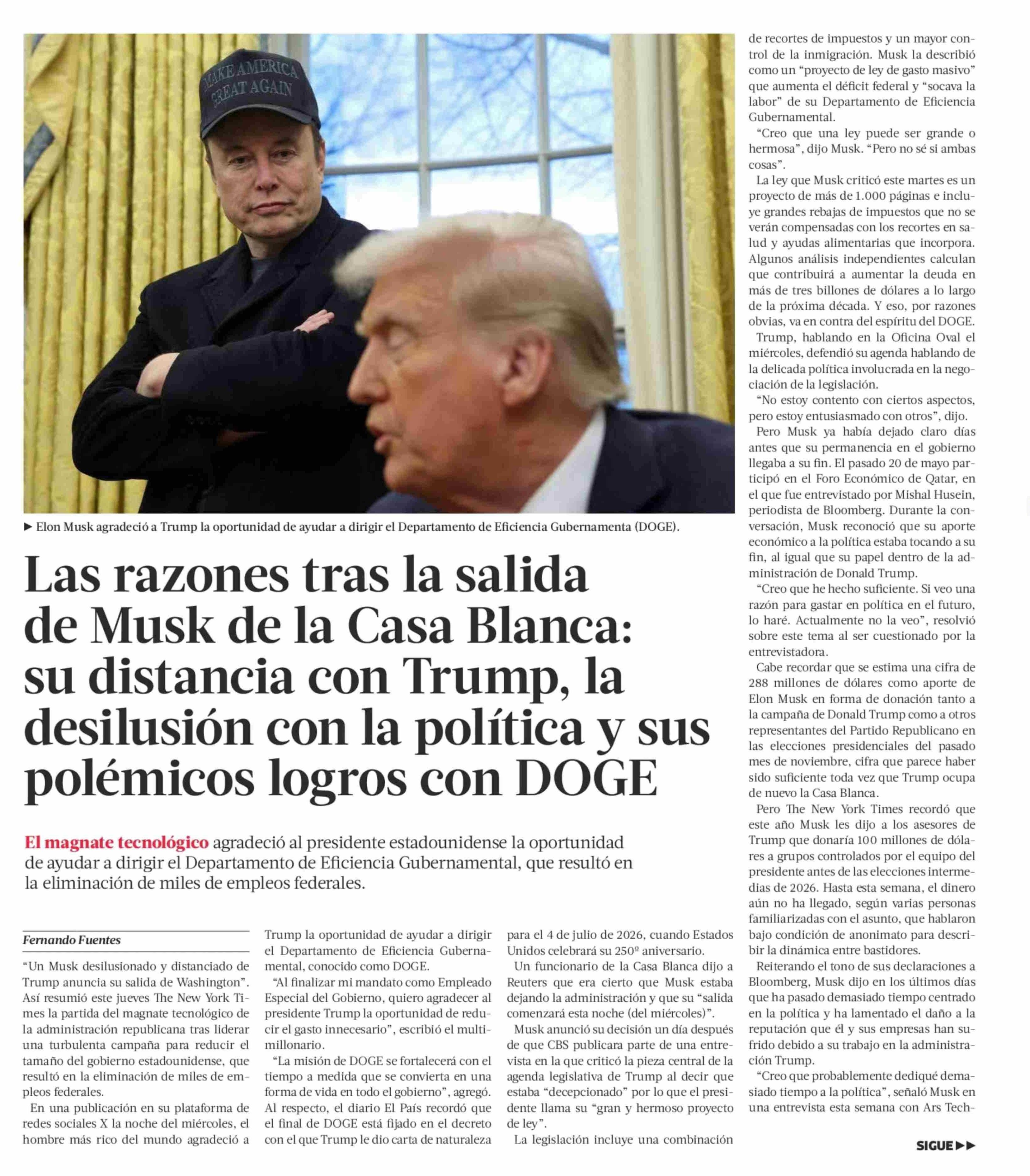 Las razones tras la salida de Musk de la Casa Blanca: su distancia con Trump, la desilusión con la política y sus polémicos logros con DOGE 30-05-2025 La Tercera |