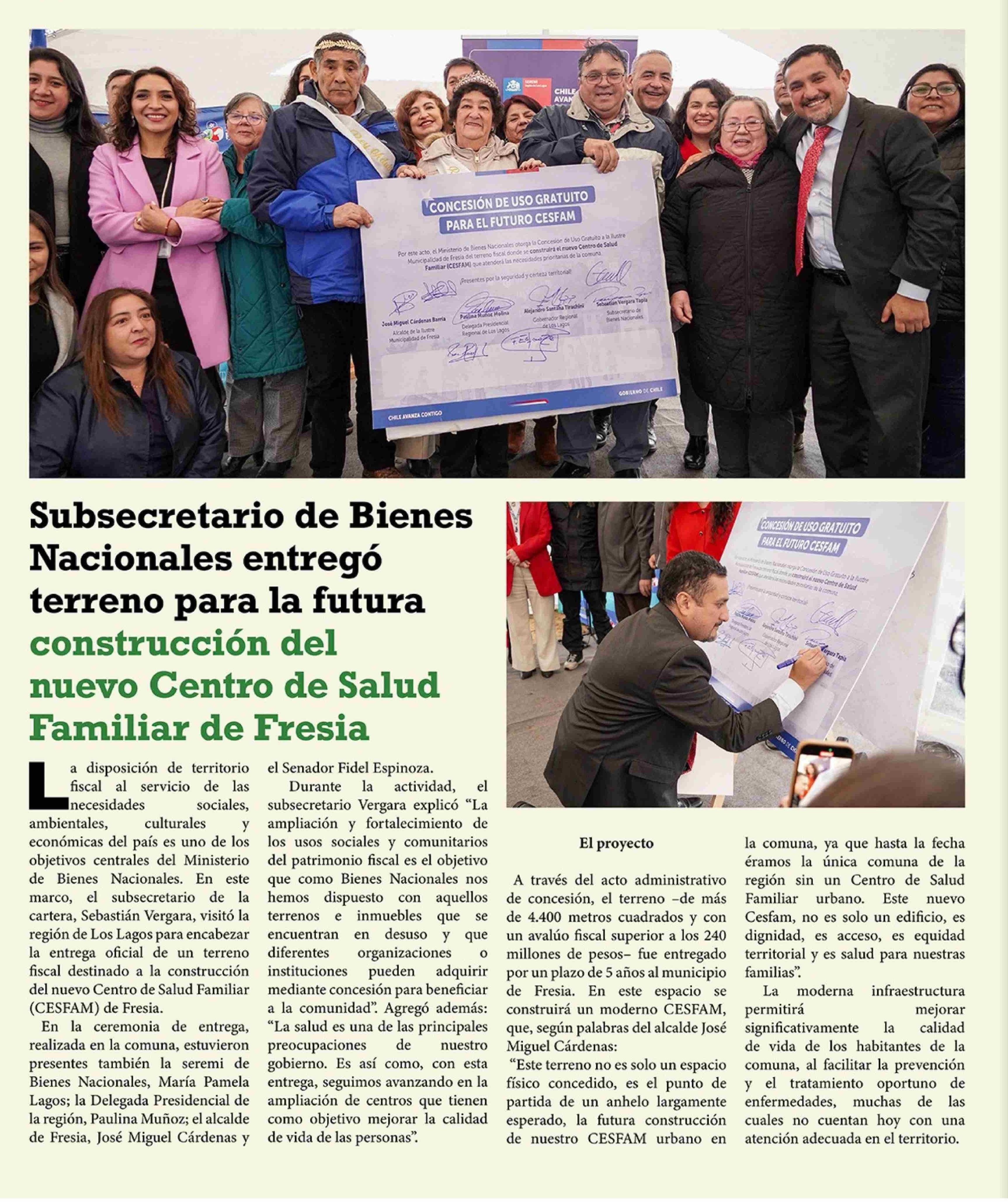 Subsecretario de Bienes Nacionales entregó terreno para la futura construcción del nuevo Centro de Salud Familiar de Fresia 17-06-2025 El Heraldo Austral |