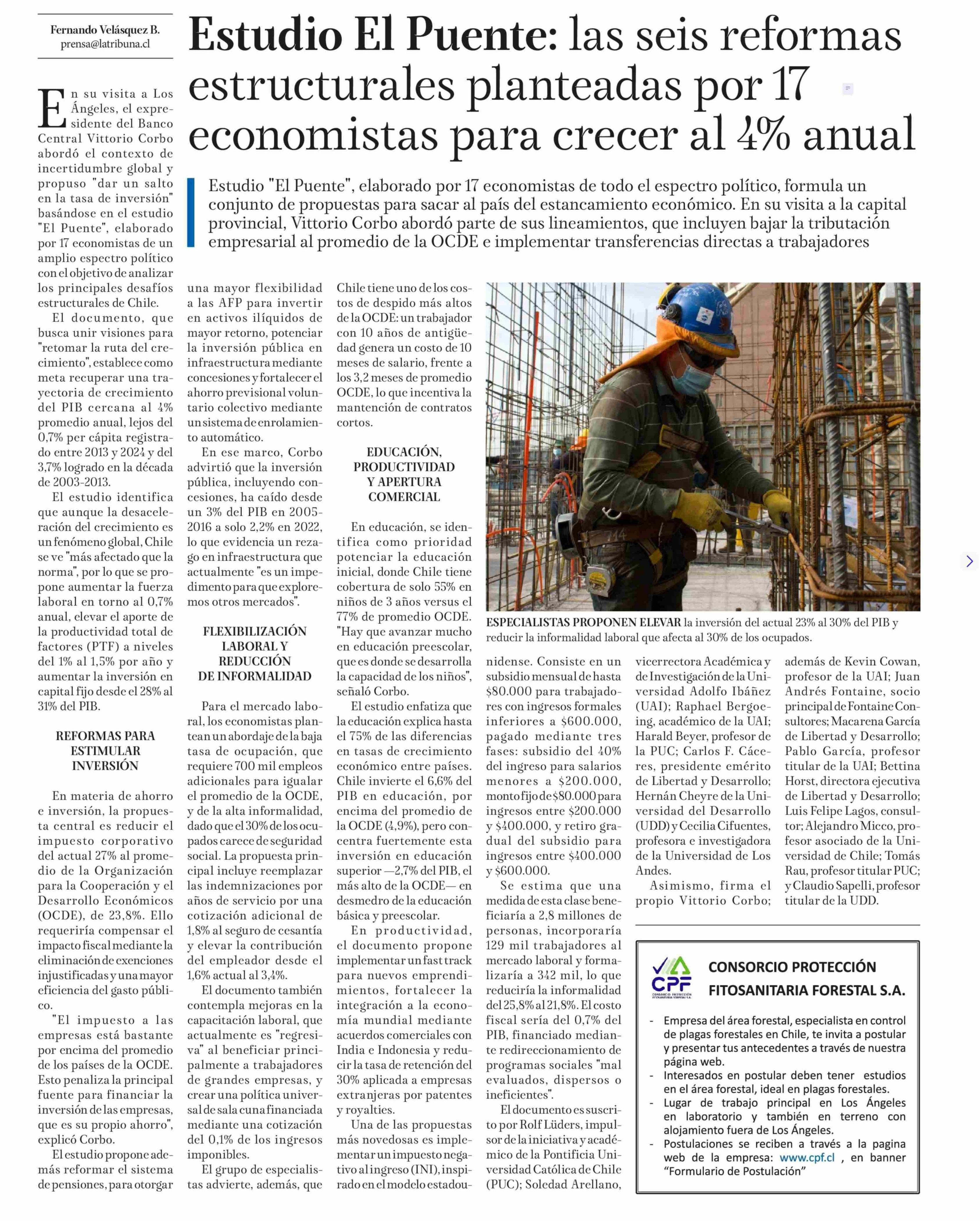 Estudio El Puente: las seis reformas estructurales planteadas por 17 economistas para crecer al 4% anual 14-07-2025 La Tribuna |