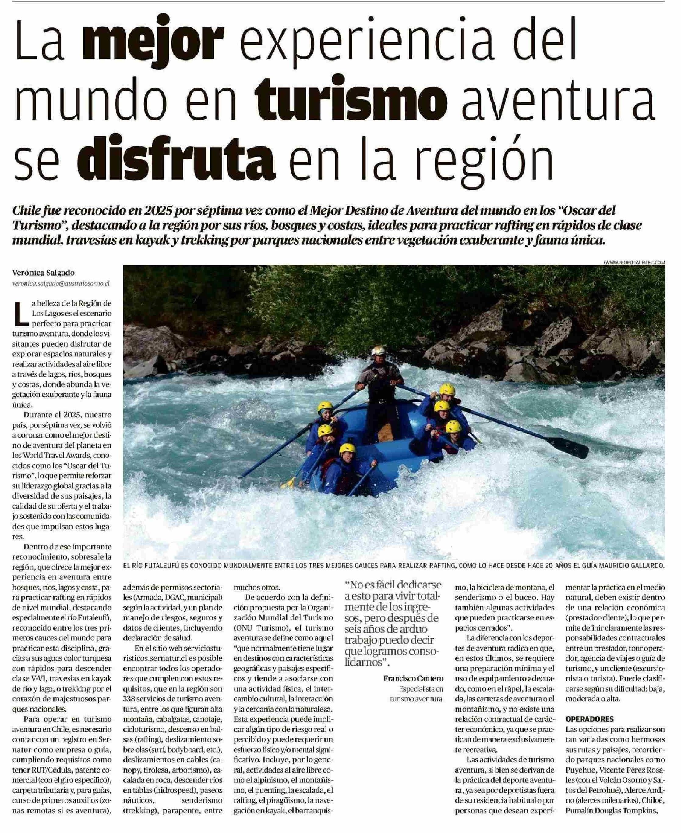 La mejor experiencia del mundo en turismo aventura se disfruta en la región 11-01-2026 El Austral de Osorno |