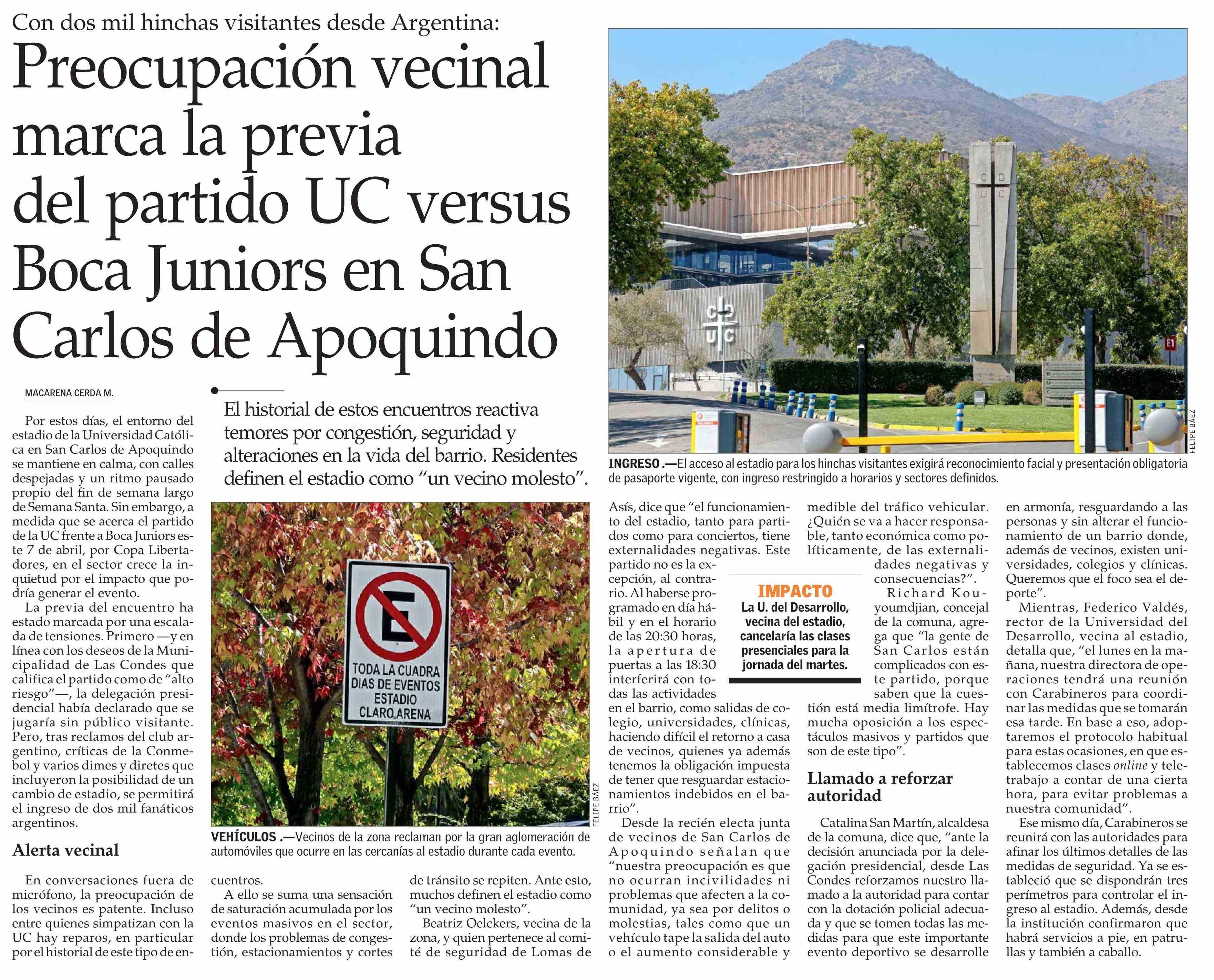 Título: Preocupación vecinal marca la previa del partido UC versus Boca Juniors en San Carlos de Apoquindo