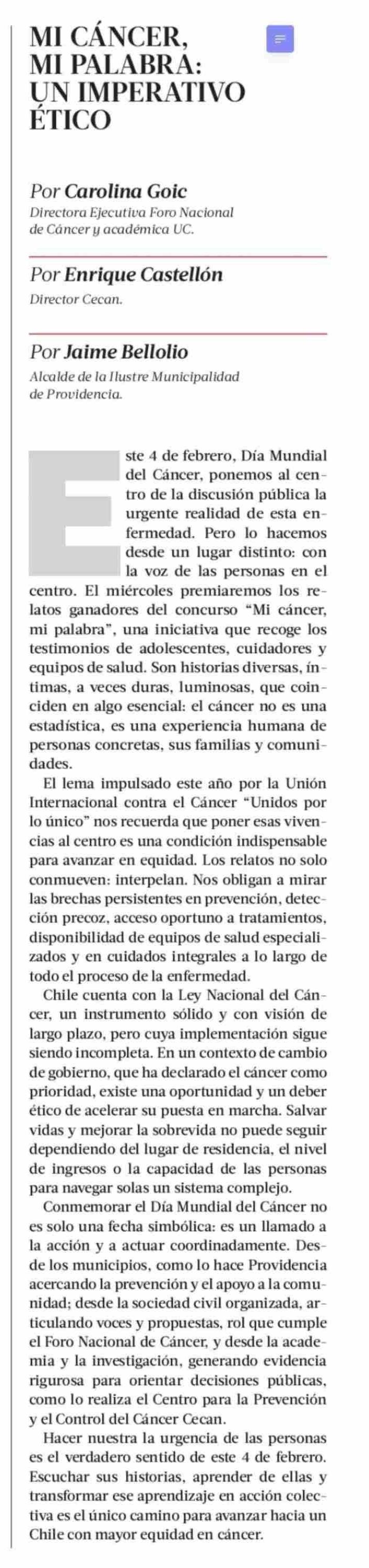 Título: COLUMNAS DE OPINIÓN: MI CÁNCER, MI PALABRA: UN IMPERATIVO ÉTICO
