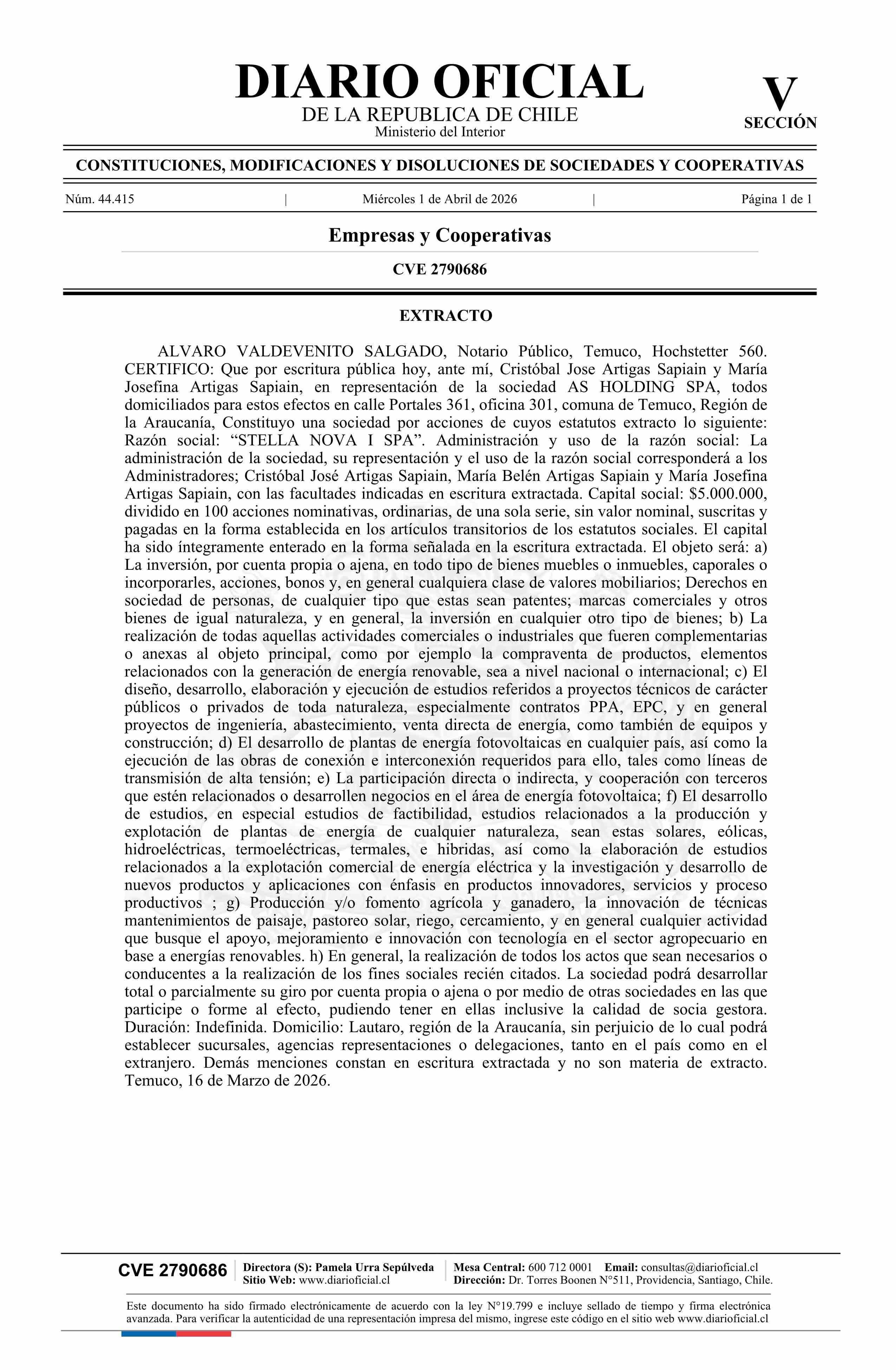 STELLA NOVA I SpA 01-04-2026 Diario Oficial Edición Electrónica |