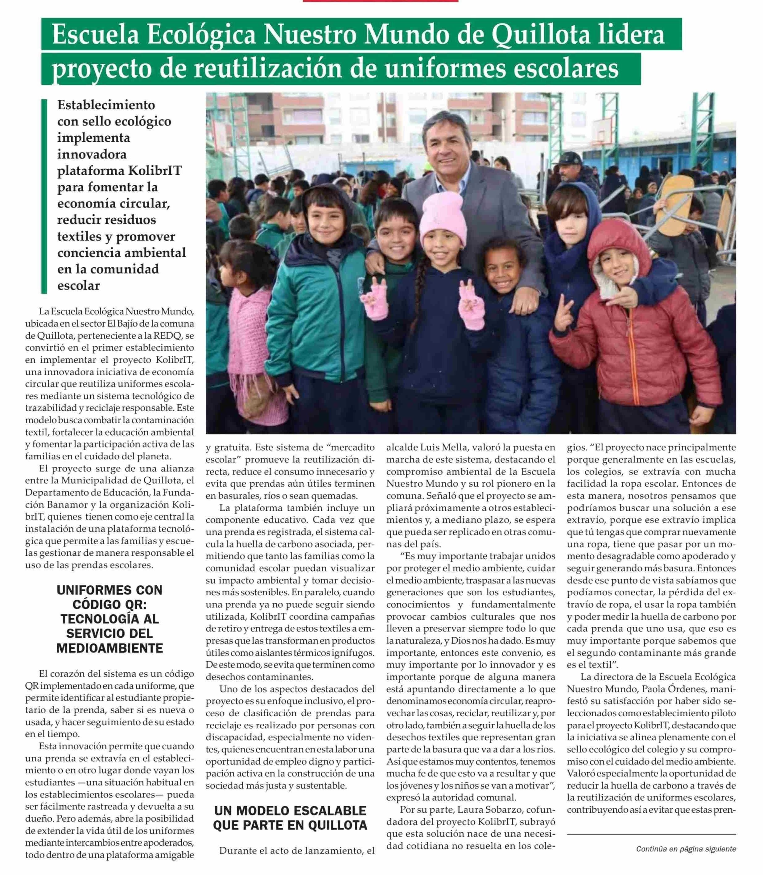 | Título: | Escuela Ecolojca Nuestro Mundo de Quillota lidera proecto de reutilización de uniformes escolares |