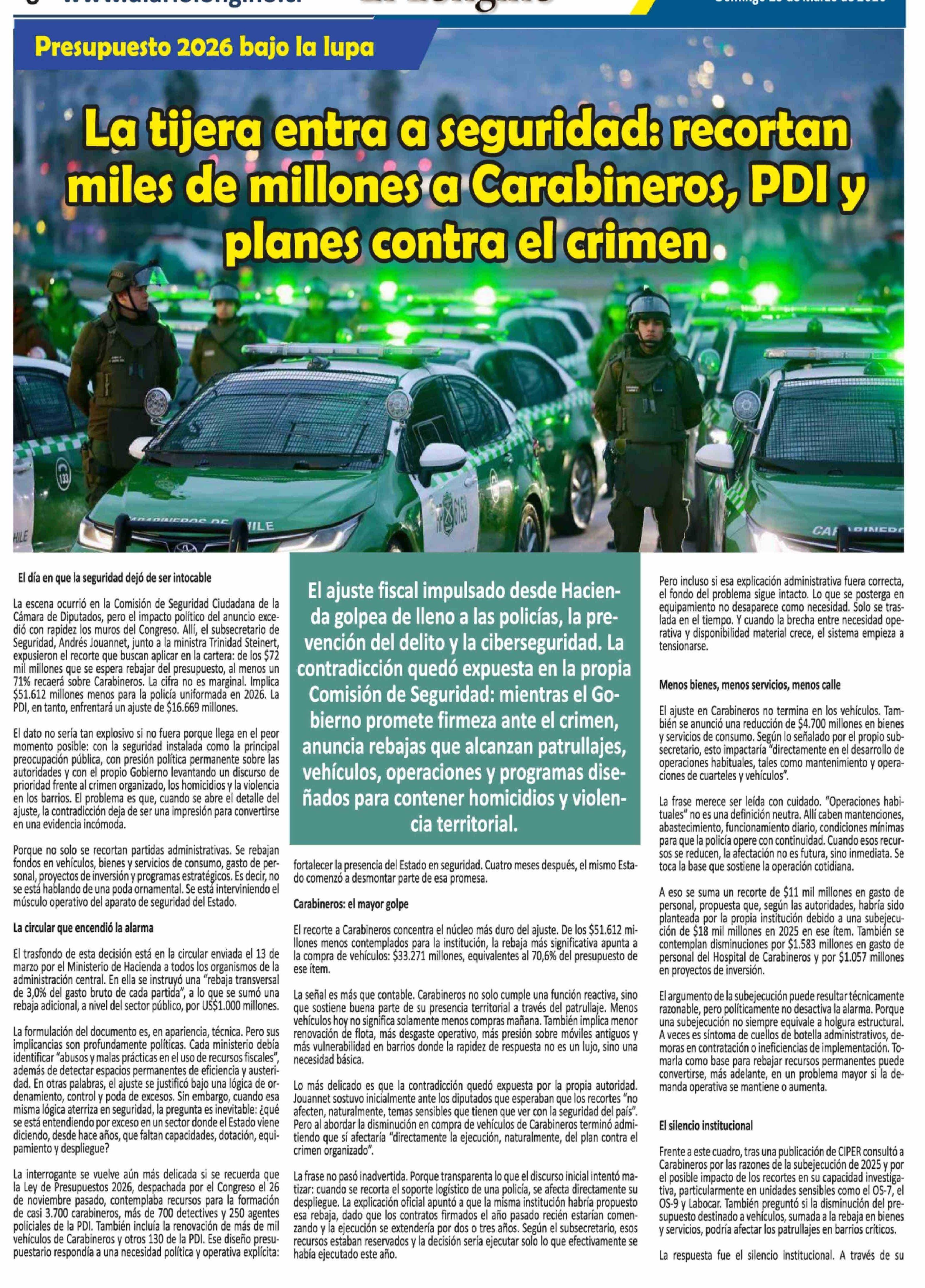 La tijera entra a seguridad: recortan miles de millones a Carabineros, PDI y planes contra el crimen 29-03-2026 El Longino |