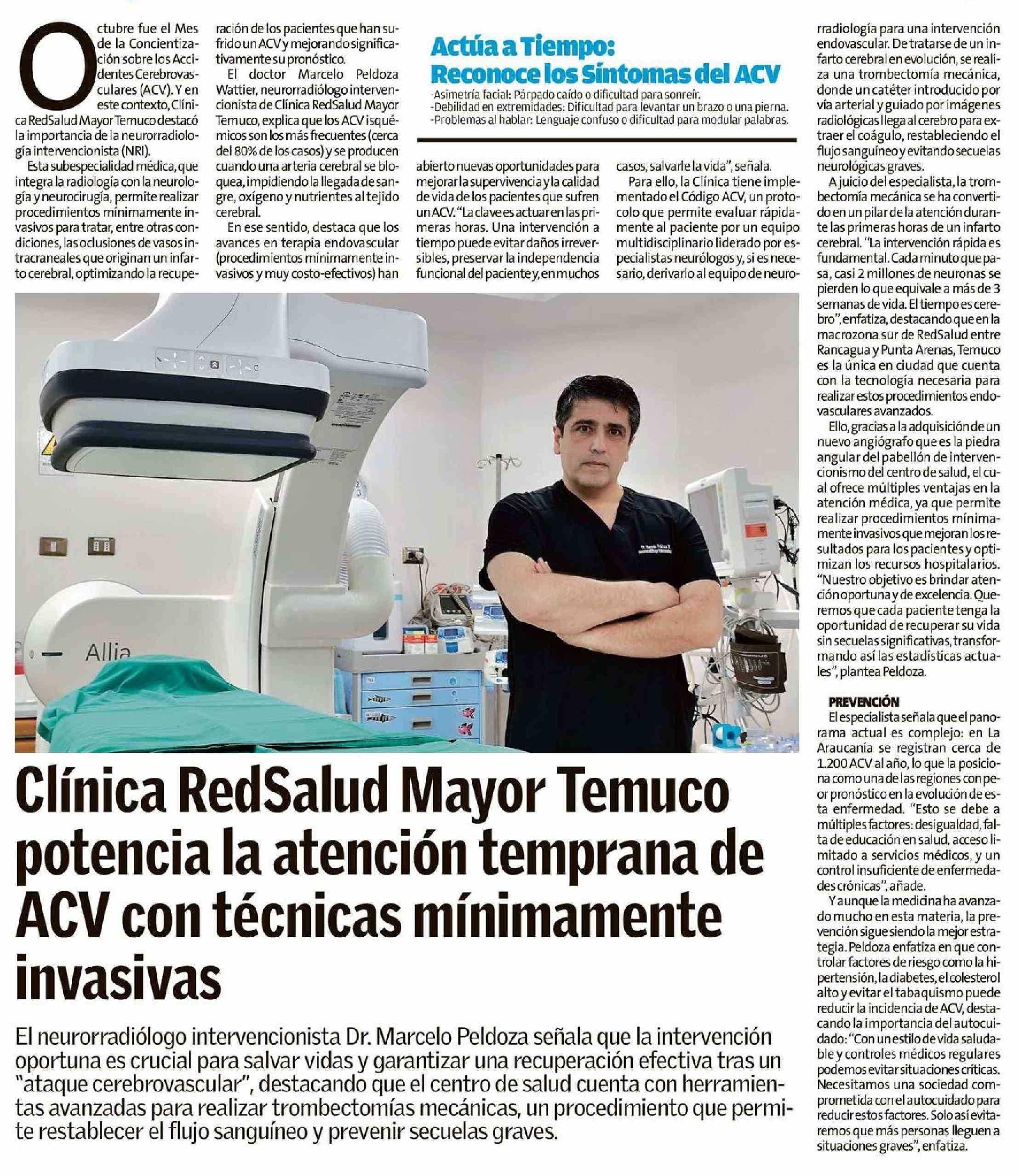Clínica RedSalud Mayor Temuco potencia la atención temprana de Invasivas ACV con técnicas mínimamente 10-11-2024 El Austral de la Araucanía |