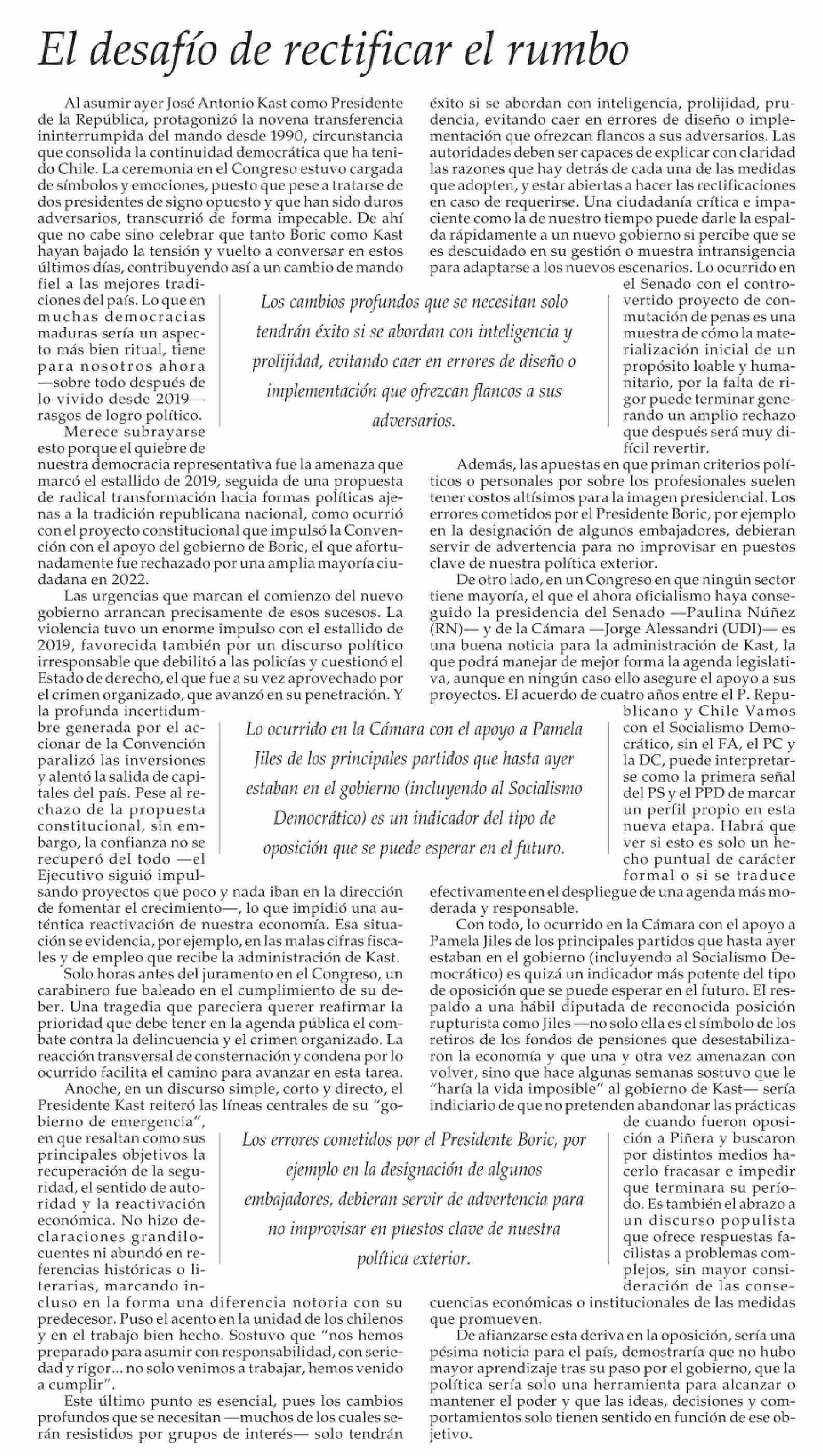 EDITORIAL: El desafío de rectificar el rumbo 12-03-2026 El Mercurio |