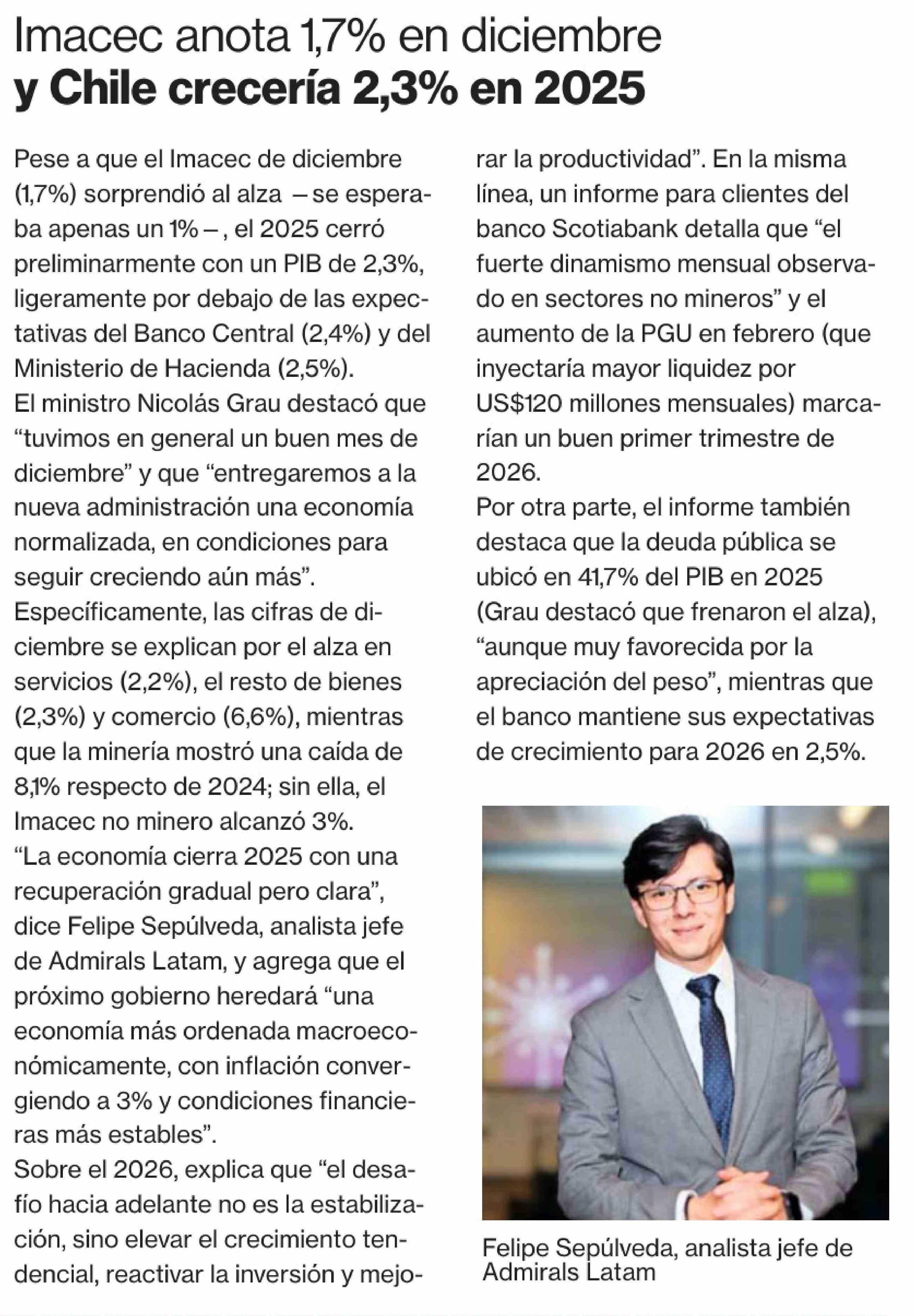 Imacec anota 1,7% en diciembre y Chile crecería 2,3% en 2025 02-02-2026 La Segunda |