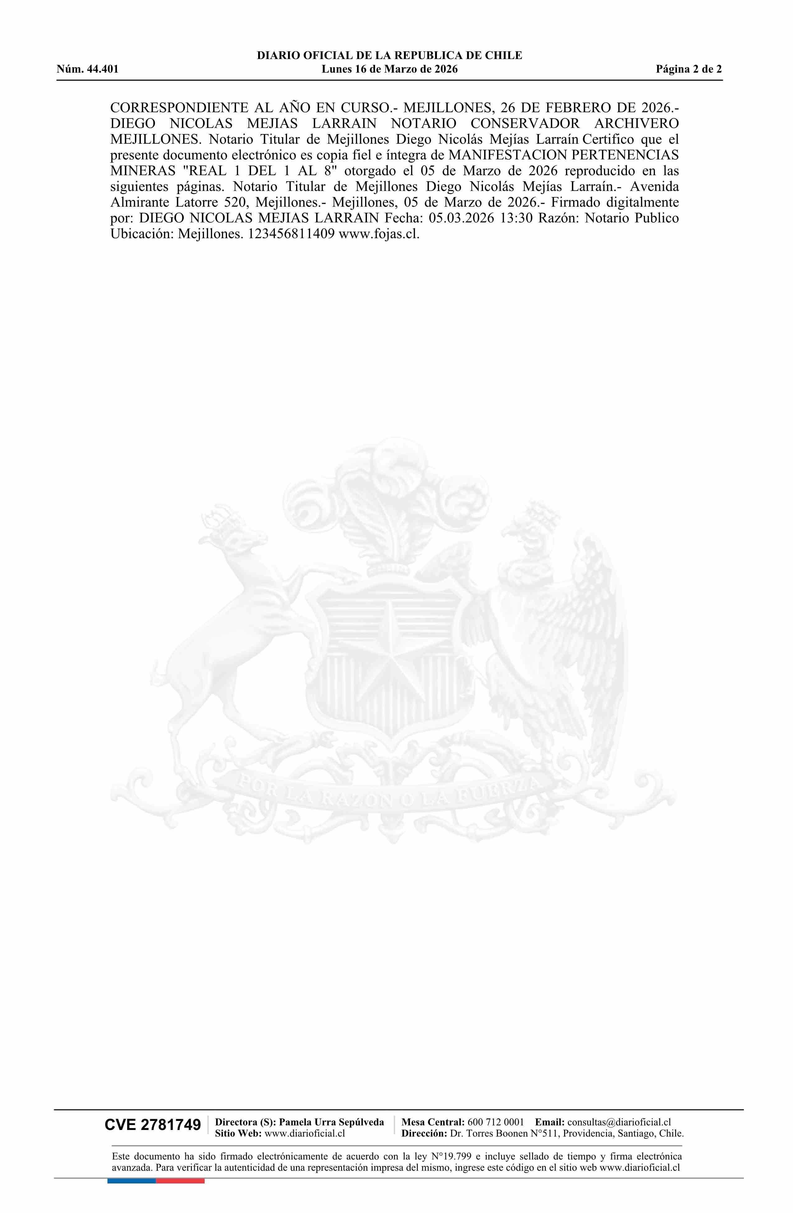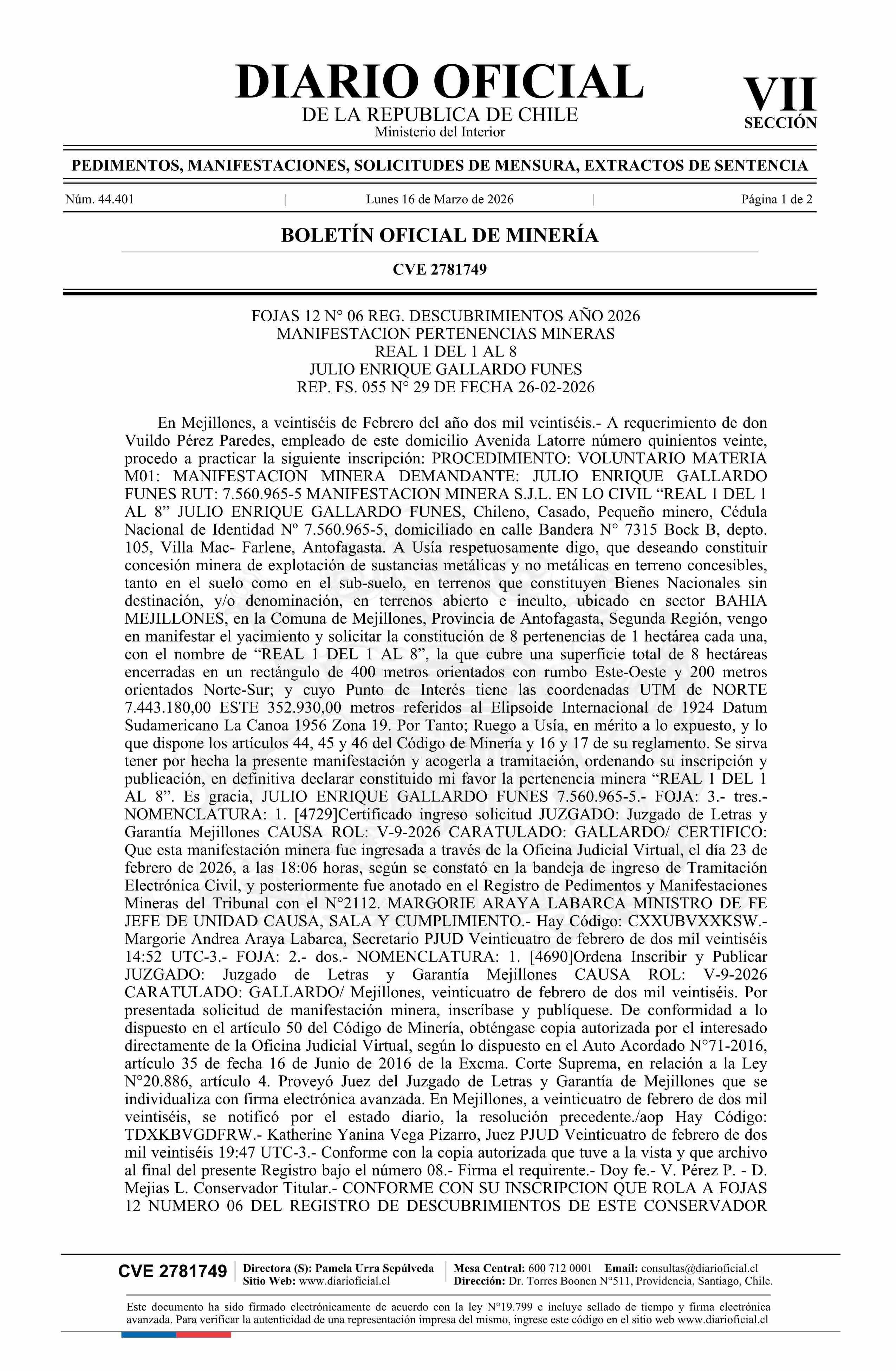 REAL 1 DEL 1 AL 8 / Gallardo Funes Julio Enrique 16-03-2026 DIARIO OFICIAL CHILE - BOLETÍN OFICIAL DE MINERÍA |