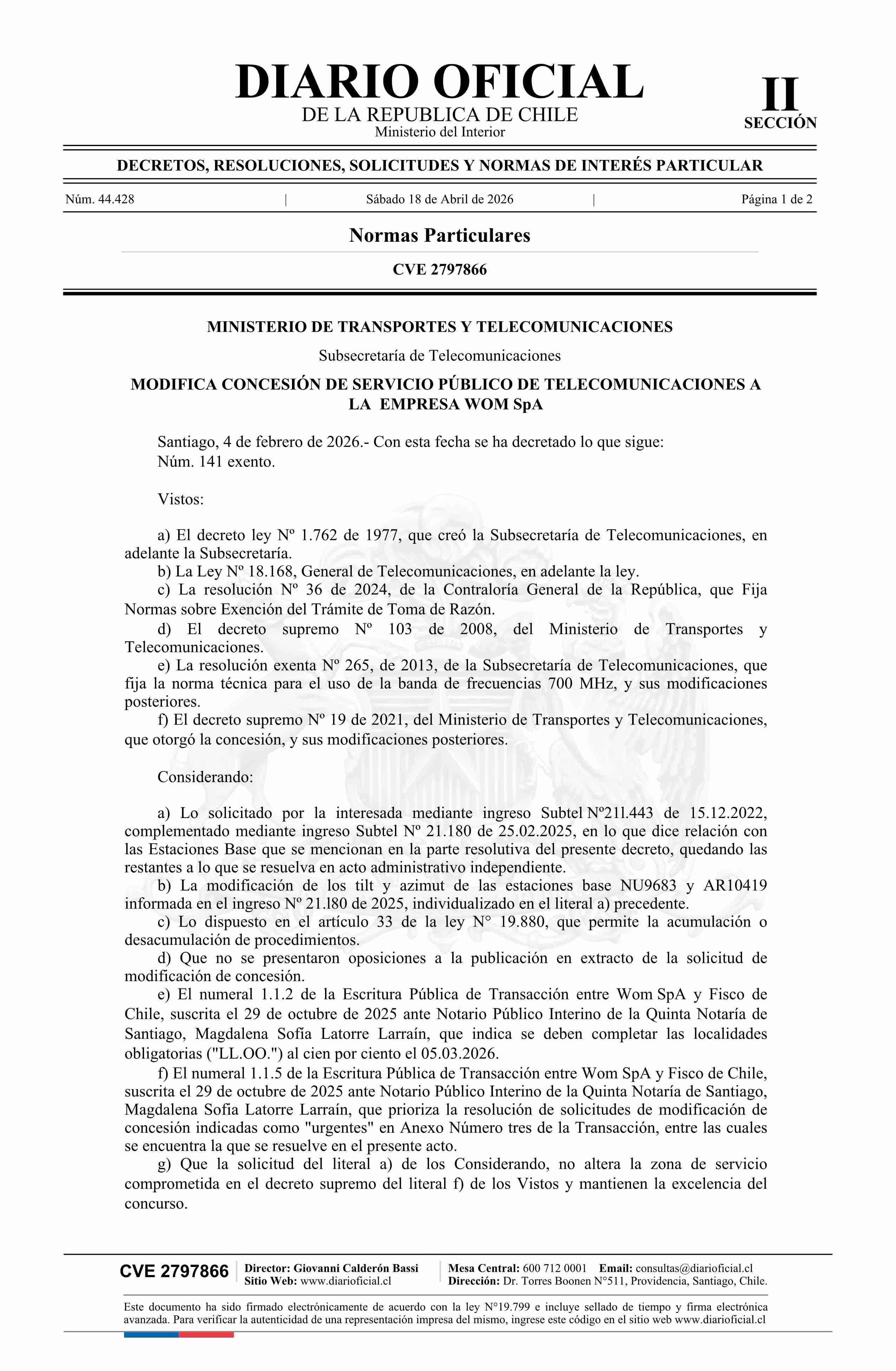 | Título: | Decreto exento número 141, de 2026.- Modifica concesión de servicio público de telecomunicaciones a la empresa Wom SpA |
