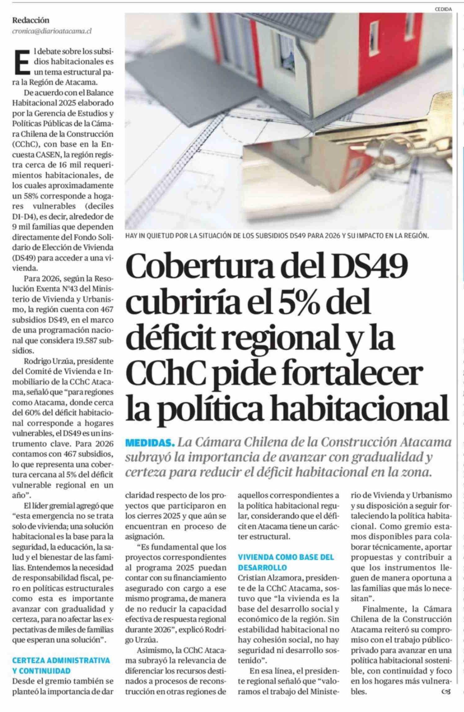 Título: Cobertura del DS49 cubriría el 5% del déficit regional y la CChC pide fortalecer la política habitacional