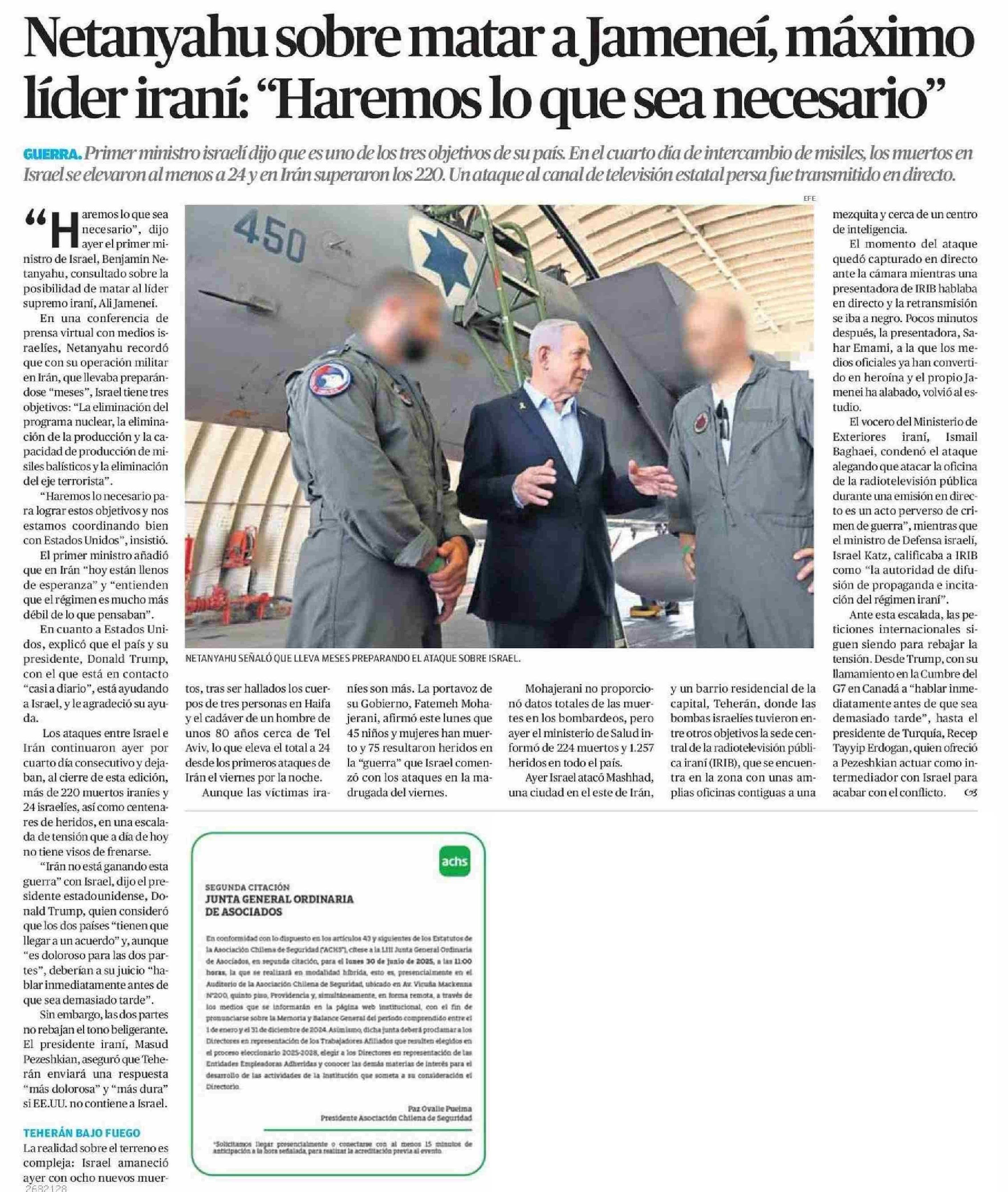 Netanyahu sobre matar a Jameneí, máximo líder iraní: “Haremos lo que sea necesario” 17-06-2025 El Mercurio de Calama |