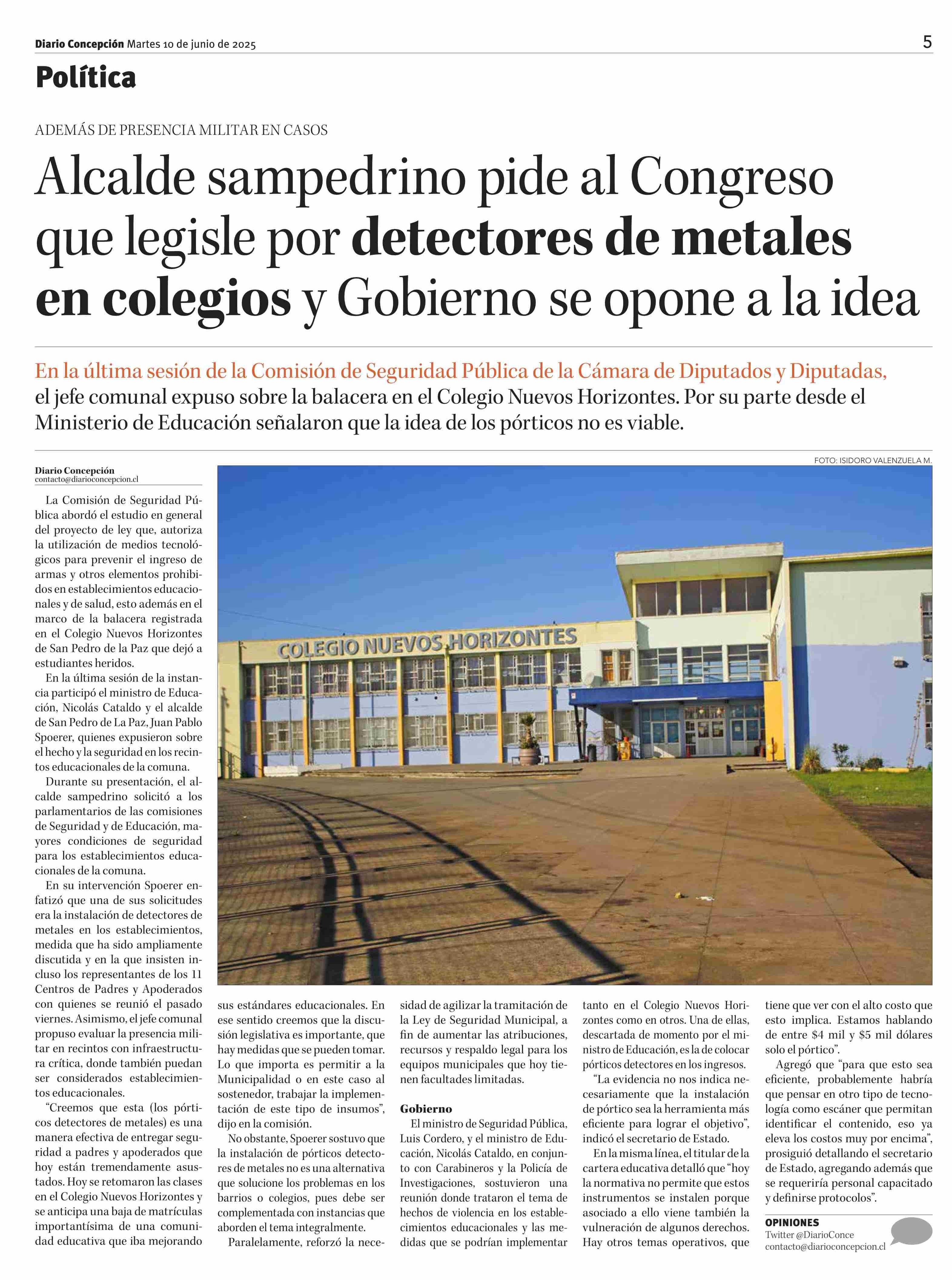 Alcalde sampedrino pide al Congreso que legisle por detectores de metales en colegios y Gobierno se opone a la idea 10-06-2025 Diario Concepción |