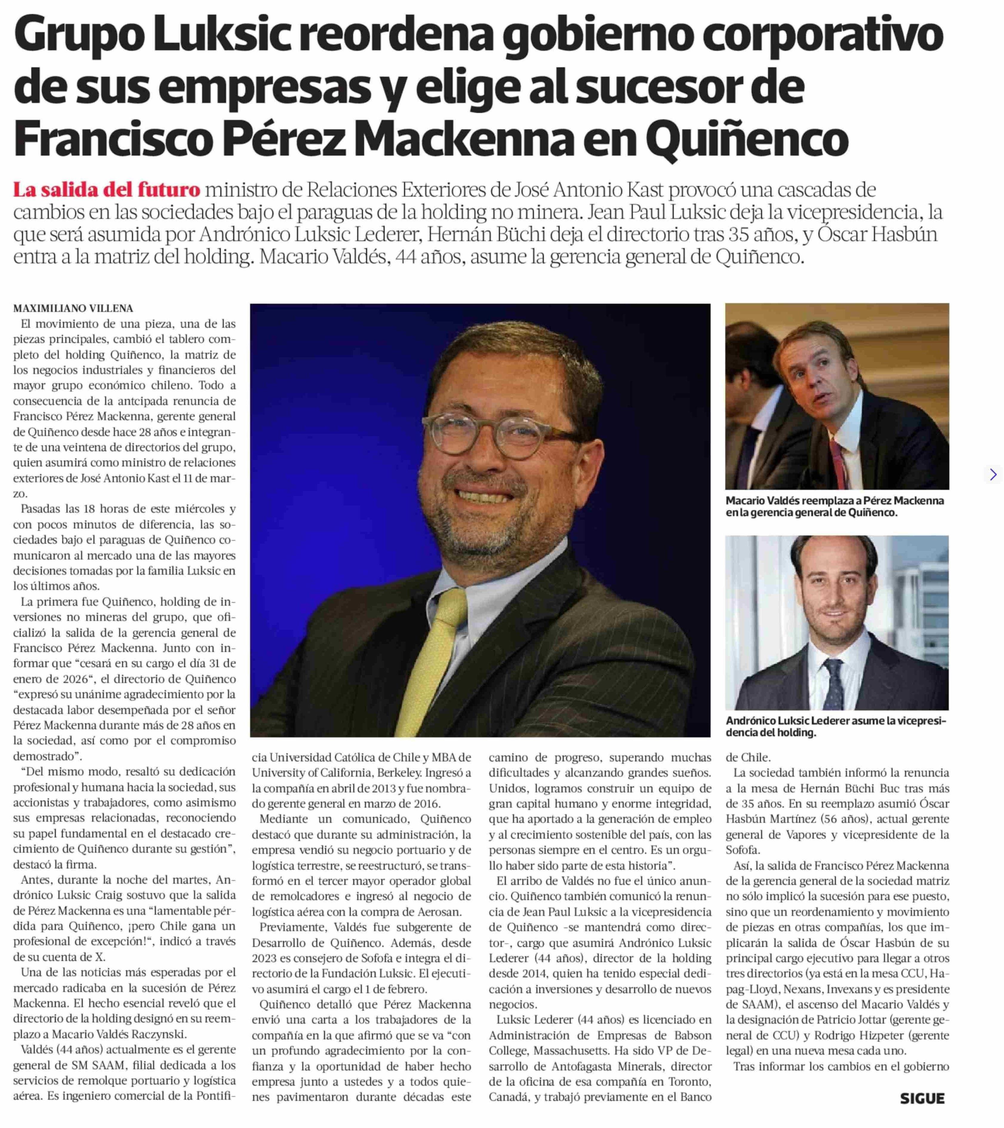 Grupo Luksic reordena gobierno corporativo de sus empresas y elige al sucesor de Francisco Pérez Mackenna en Quiñenco 22-01-2026 La Tercera |