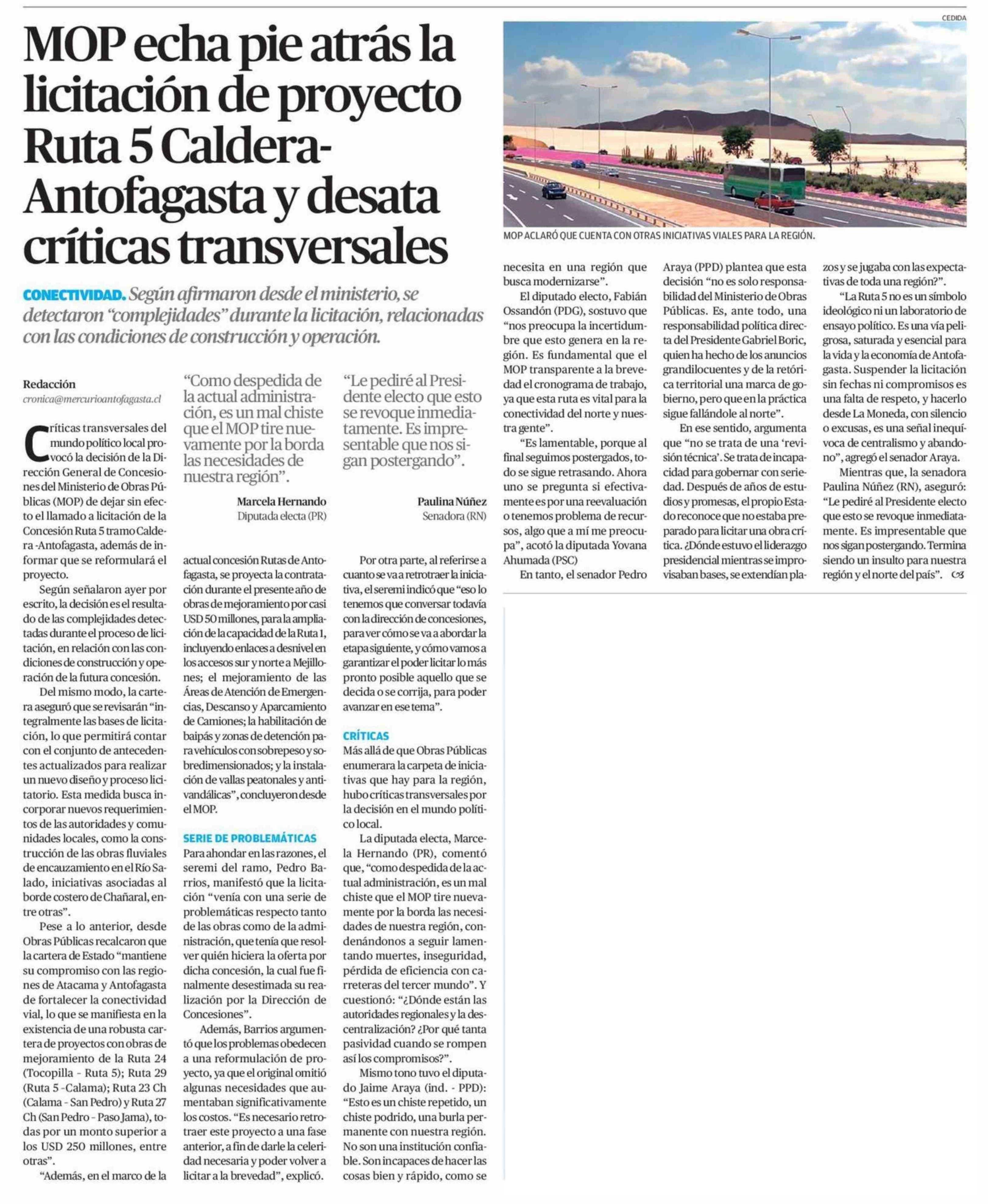 MOP echa pie atrás la licitación de proyecto Ruta 5 Caldera- Antofagasta y desata 22-01-2026 El Mercurio de Antofagasta |