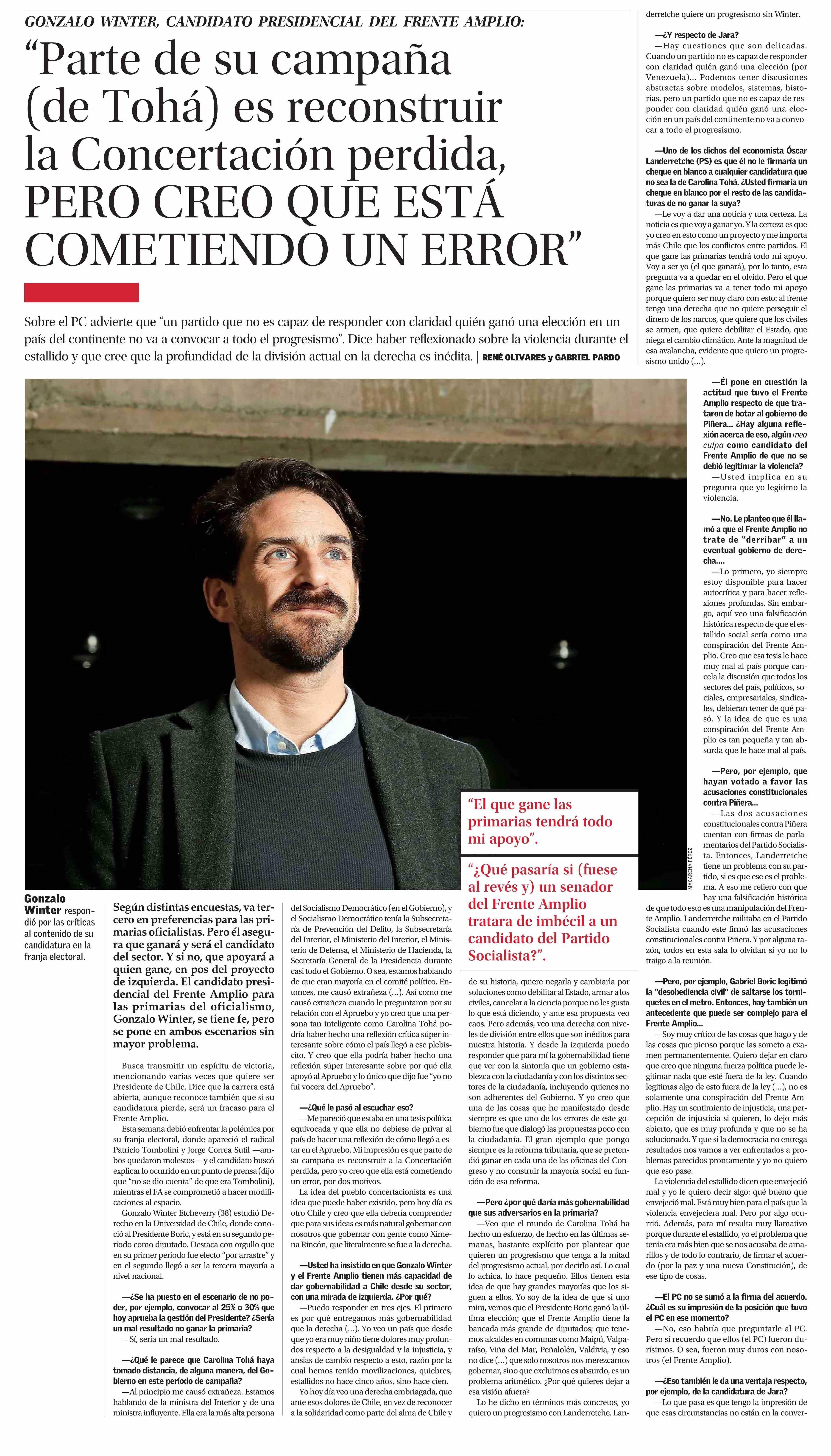 | Título: | “Parte de su campaña (de Tohá) es reconstruir la Concertación perdida, PERO CREO QUE ESTÁ COMETIENDO UN ERROR” |