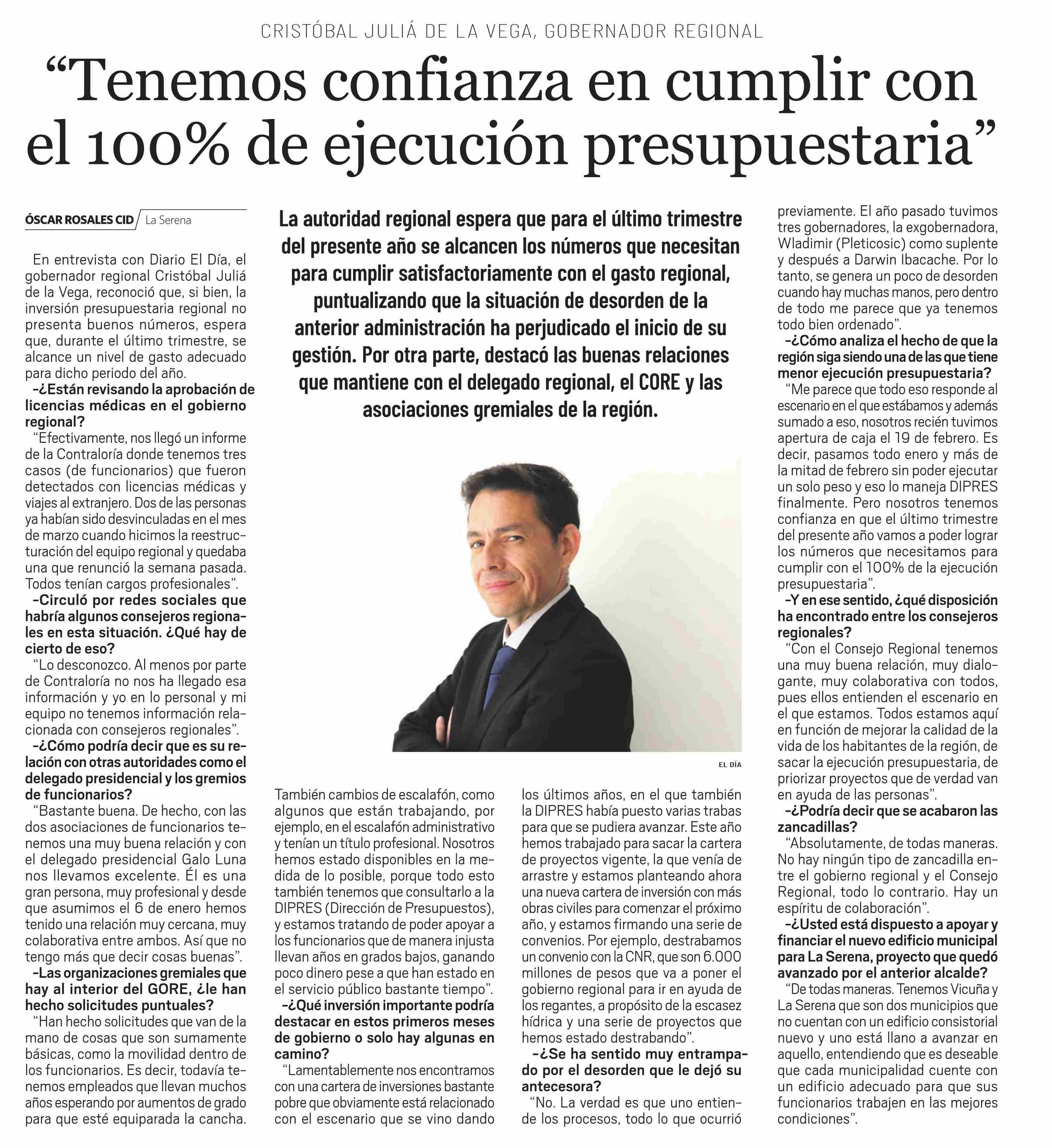 "Tenemos confianza en cumplir con el 100% de ejecución presupuestaria" 06-06-2025 El Día |