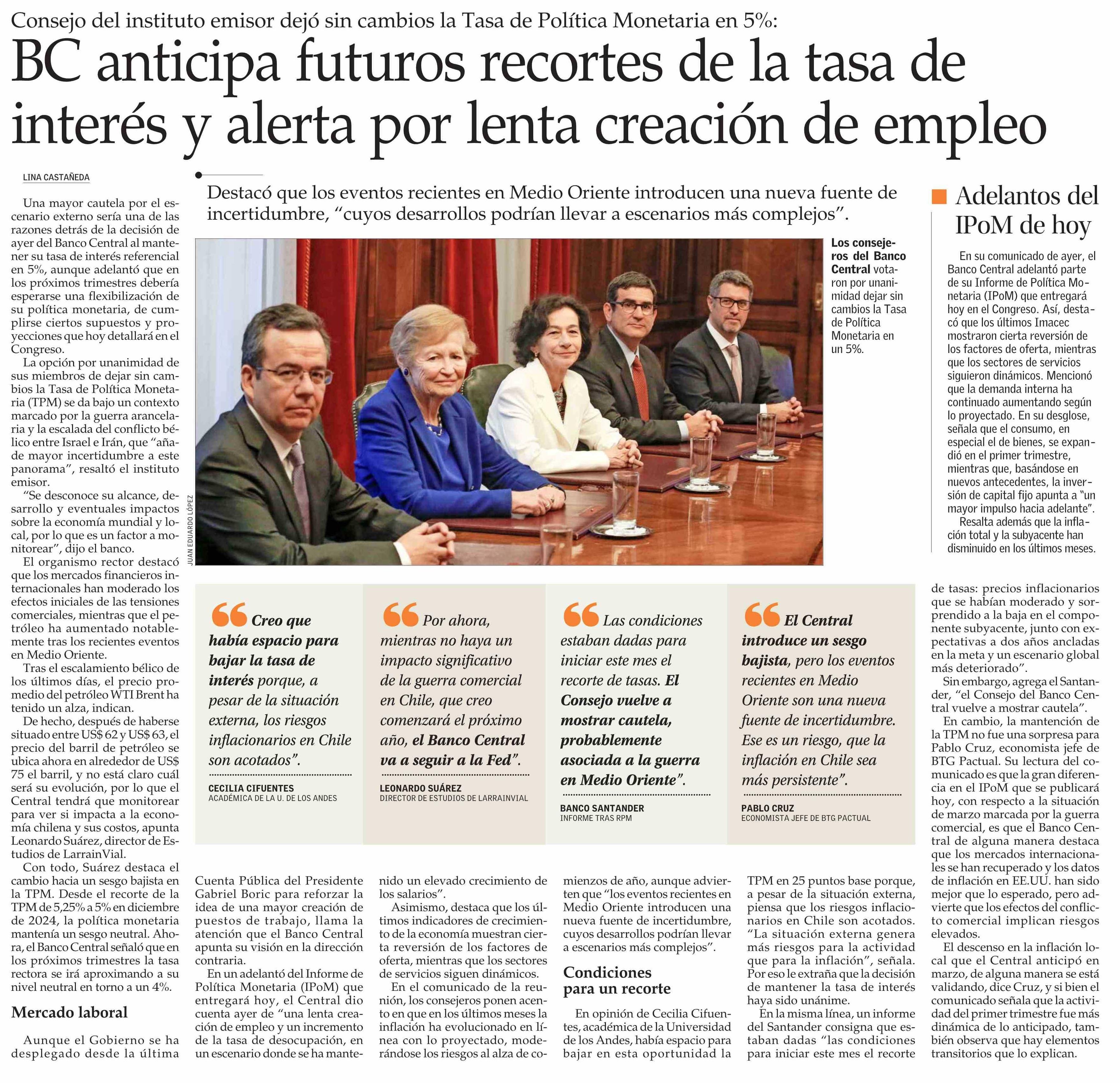 BC anticipa futuros recortes de la tasa de interés y alerta por lenta creación de empleo 18-06-2025 El Mercurio |