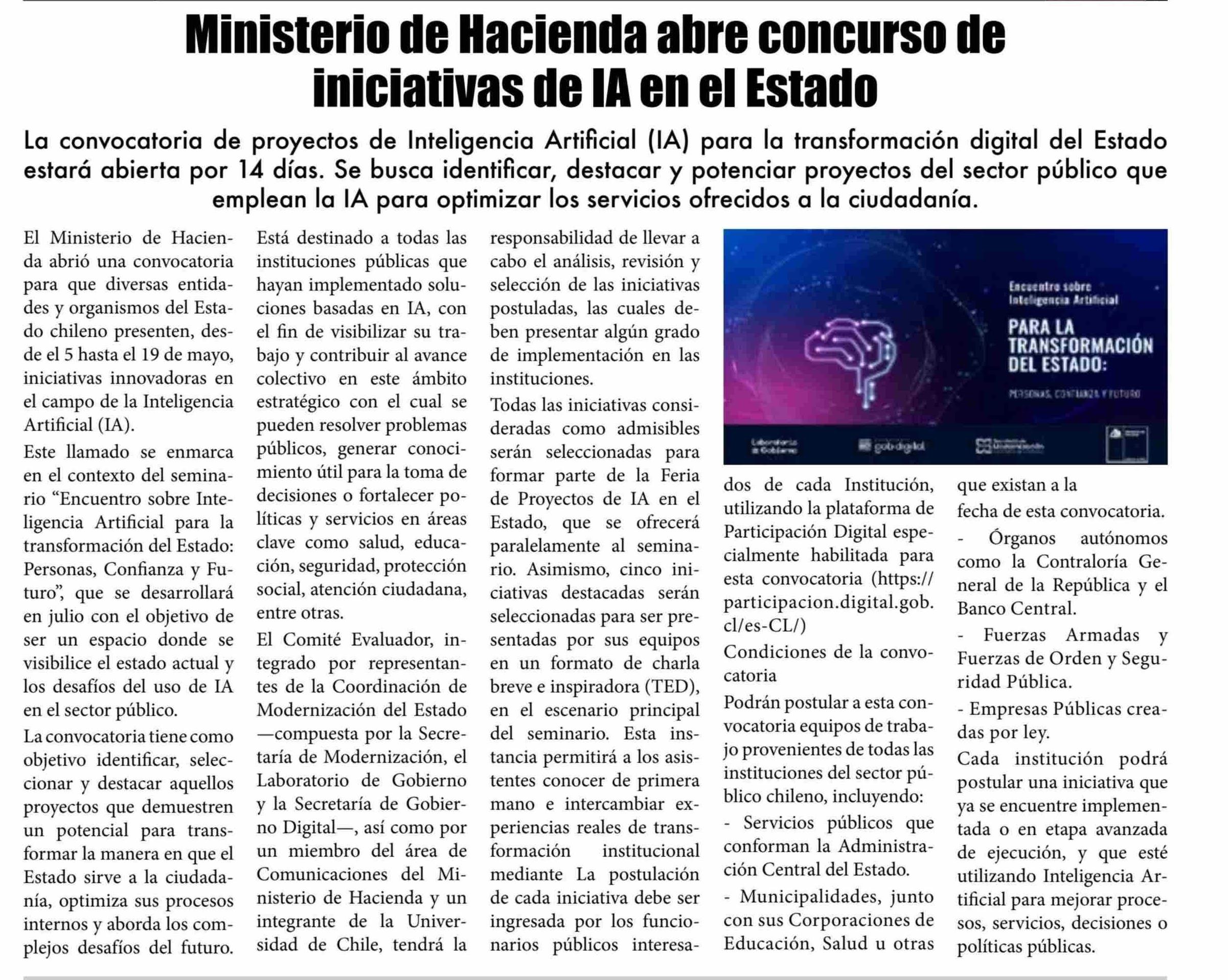 Ministerio de Hacienda abre concurso de iniciativas de lA en el Estado 09-05-2025 El Lector |