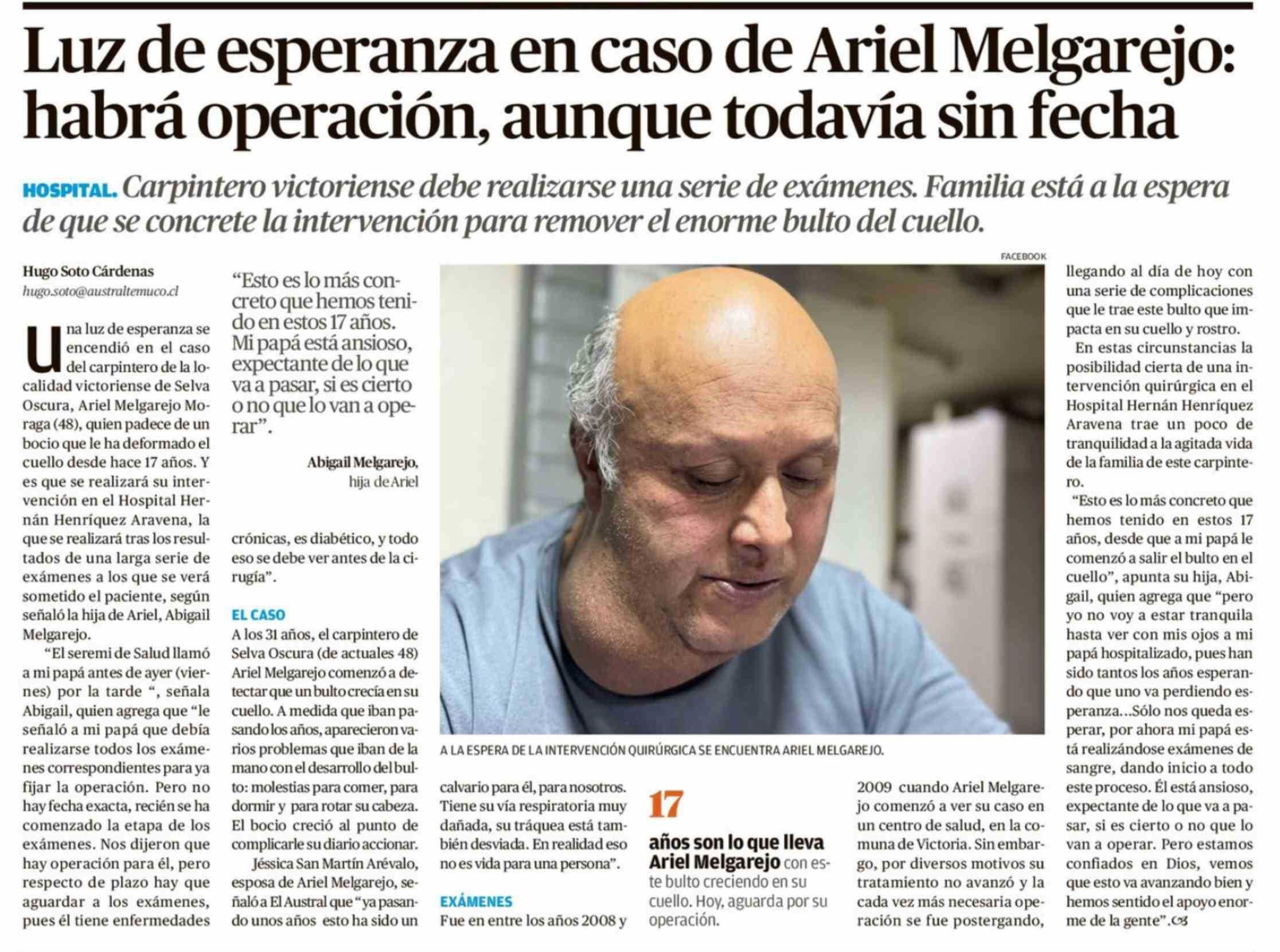 Luz de esperanza en caso de Ariel Melgarejo: habrá operación, aunque todavía sin fecha 09-03-2026 El Austral de la Araucanía |