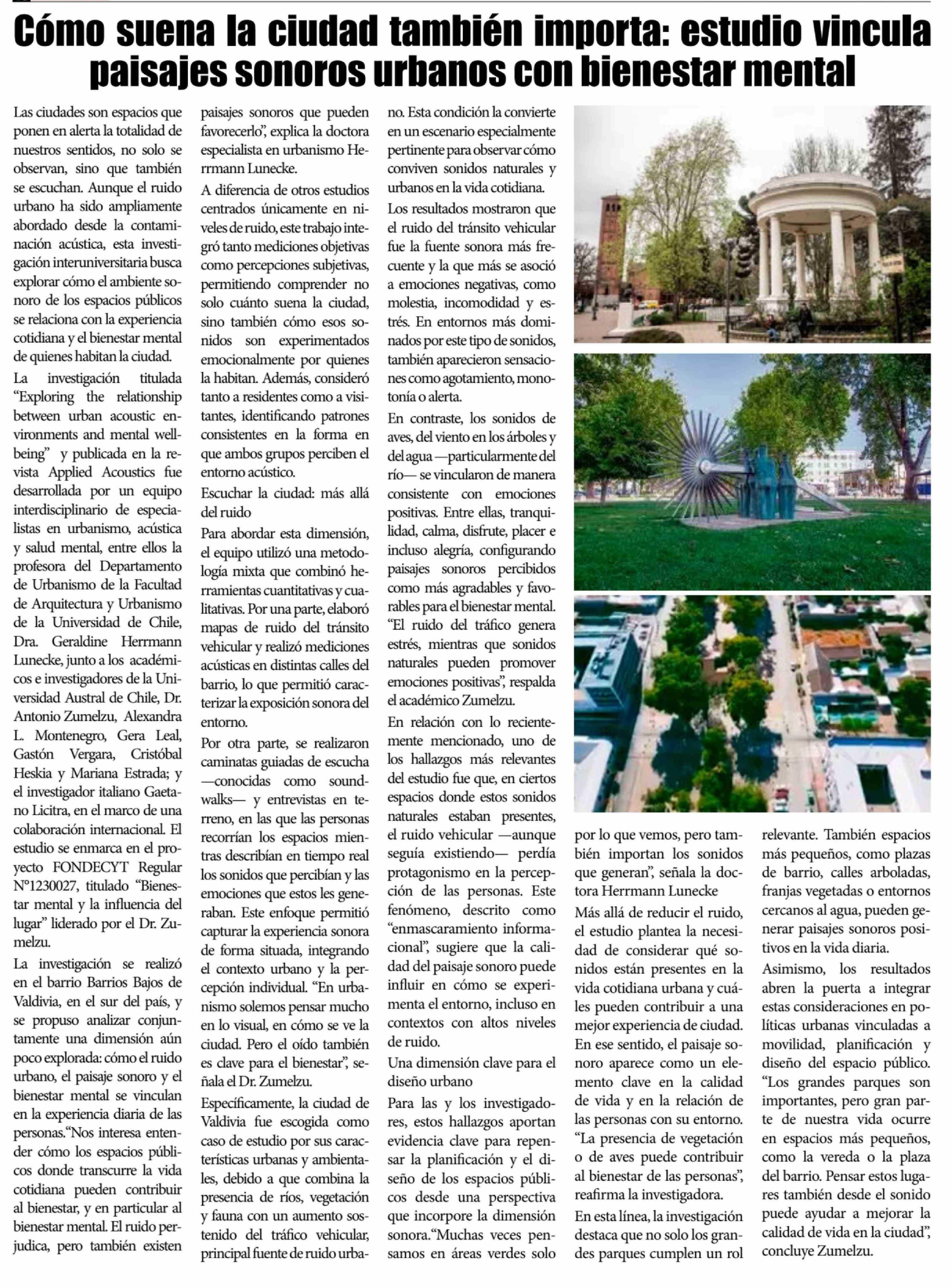 Cómo suena la ciudad también importa: estudio vincula paisajes sonoros urbanos con bienestar mental 27-03-2026 El Lector |