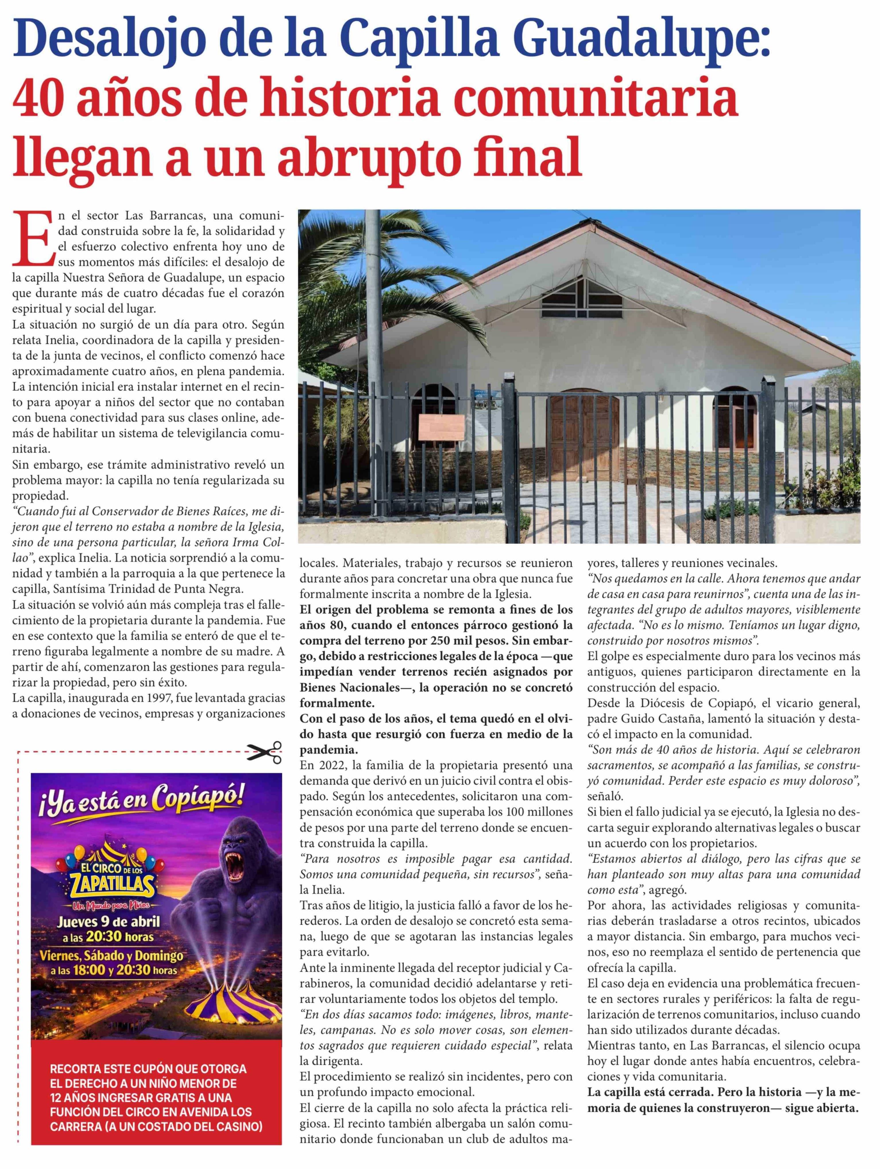Desalojo de la Capilla Guadalupe: 40 años de historia comunitaria llegan a un abrupto final 24-04-2026 Diario Chañarcillo |
