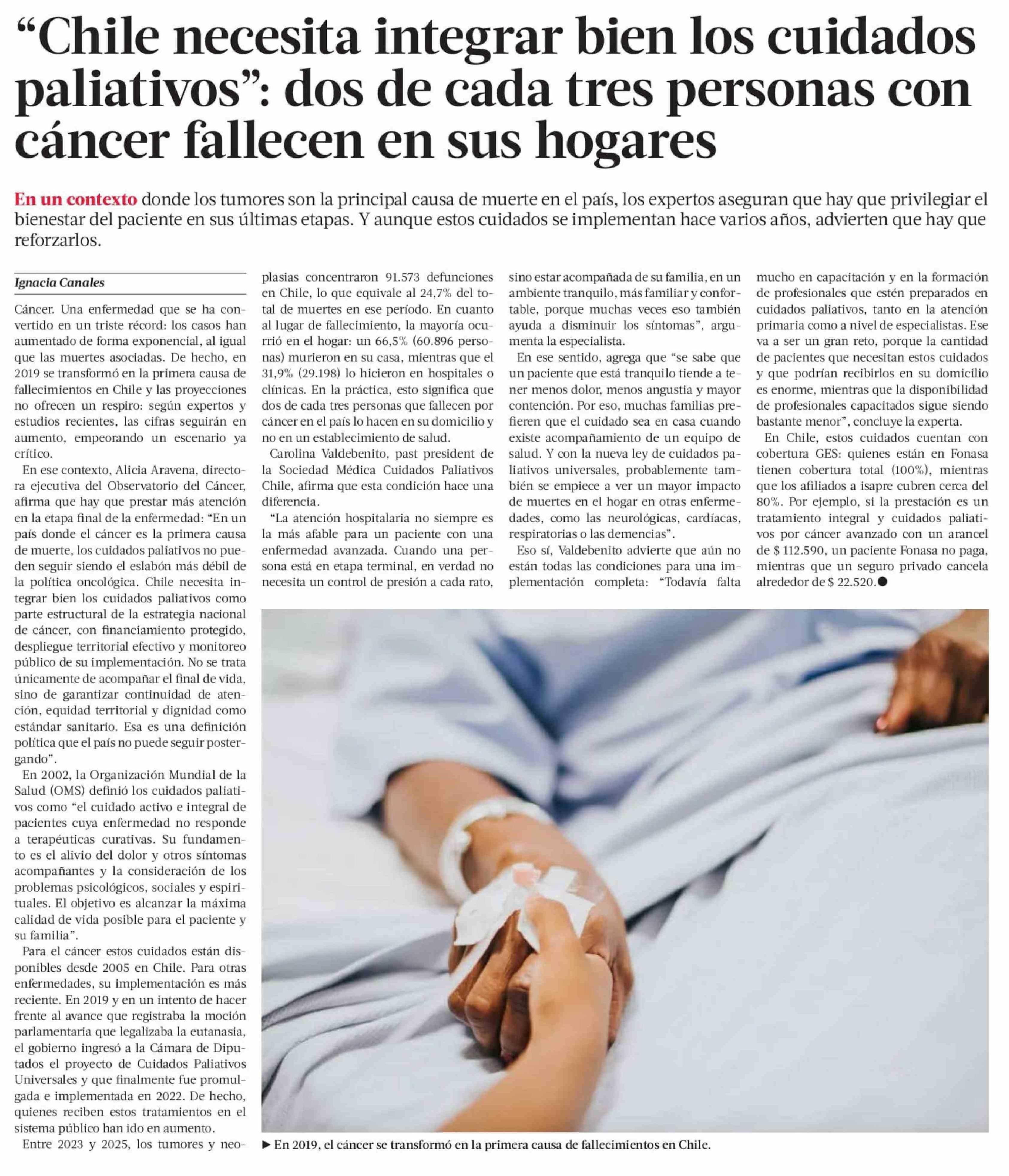 "Chile necesita integrar bien los cuidados paliativos": dos de cada tres personas con cáncer fallecen en sus hogares 18-02-2026 La Tercera |