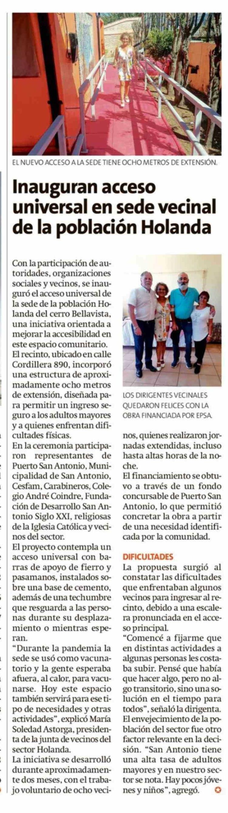 | Título: | Inauguran acceso universal en sede vecinal de la población Holanda |
