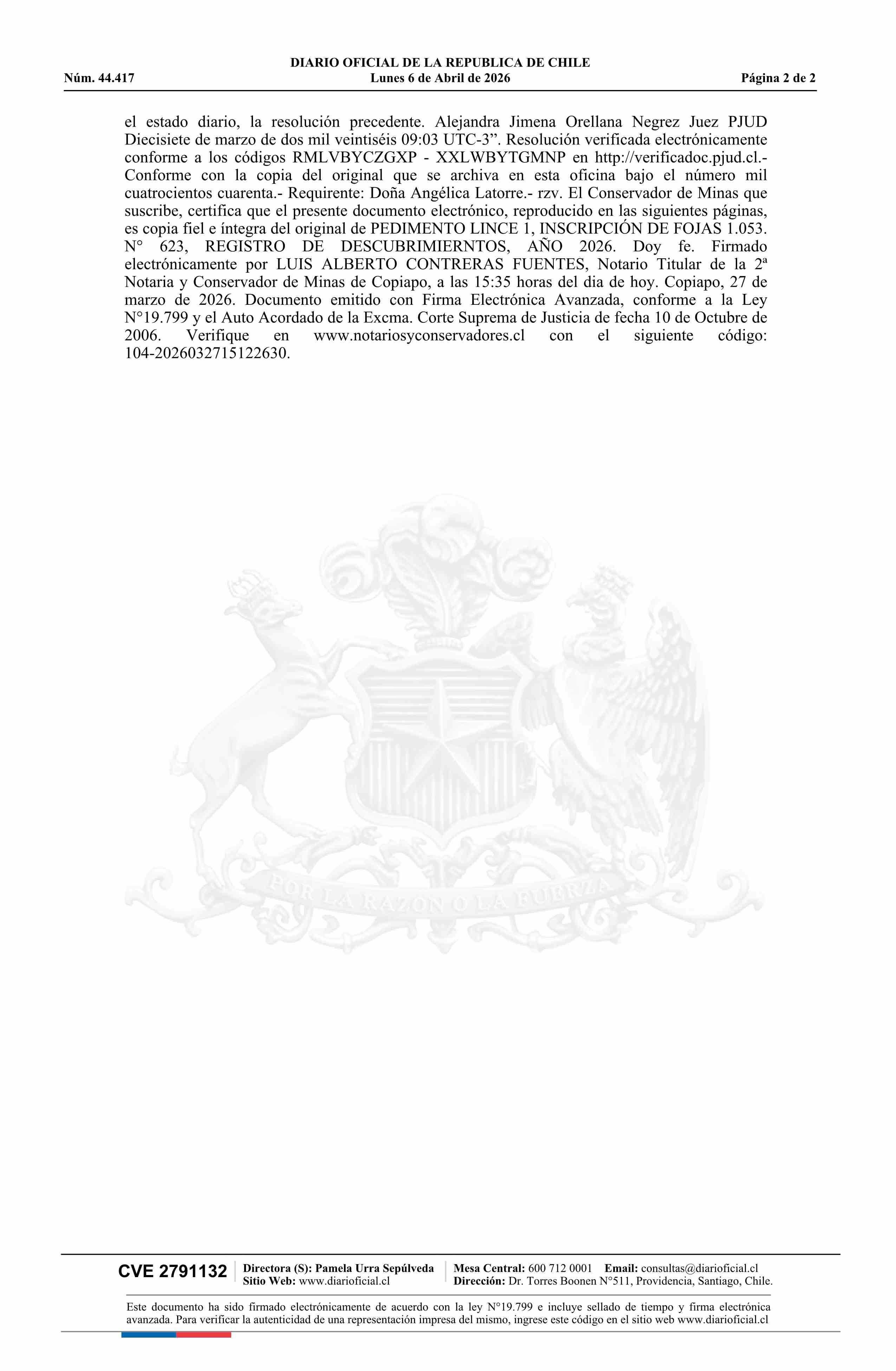 LINCE 1 / Compañía Minera Carmen Bajo Limitada 06-04-2026 DIARIO OFICIAL CHILE - BOLETÍN OFICIAL DE MINERÍA |