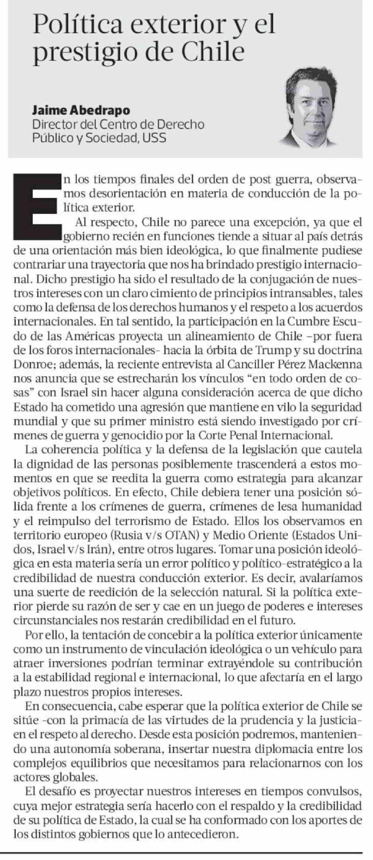 Columnas de Opinión: Política exterior y el prestigio de Chile 18-03-2026 La Tercera |