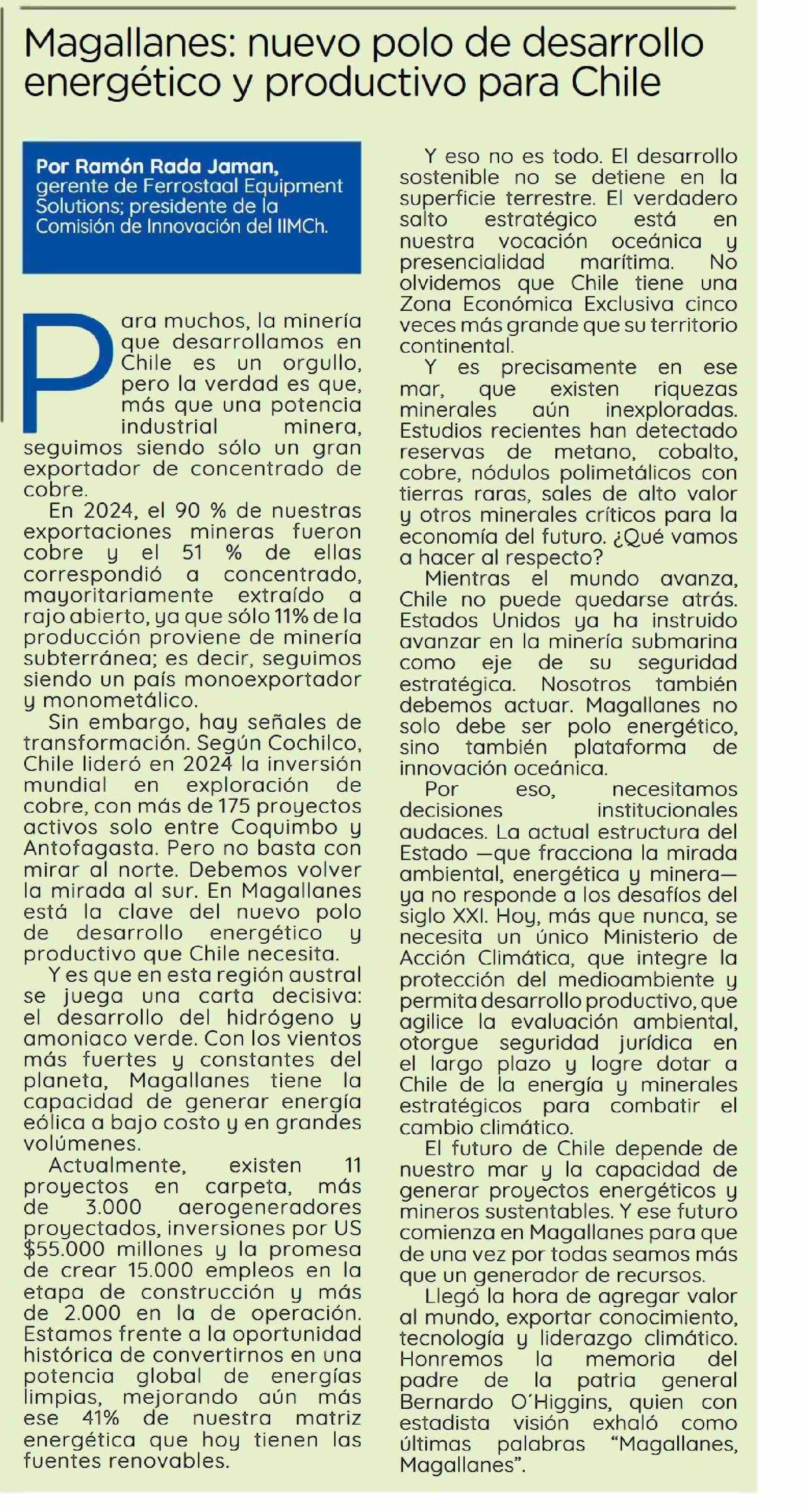 | Título: | COLUMNAS DE OPINIÓN: Magallanes: nuevo polo de desarrollo energético y productivo para Chile |