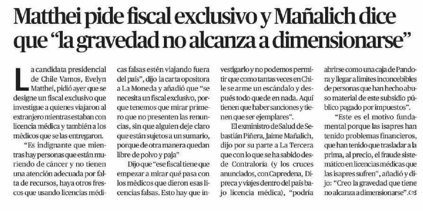 Matthei pide fiscal exclusivo y Mañalich dice que “la gravedad no alcanza a dimensionarse” 28-05-2025 El Mercurio de Calama |