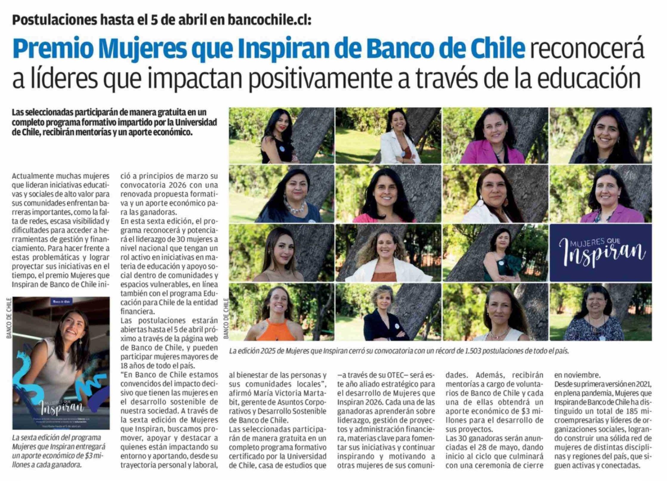 Premio Mujeres que Inspiran de Banco de Chile reconocerá a líderes que impactan positivamente a través de la educación 26-03-2026 La Estrella de Iquique |