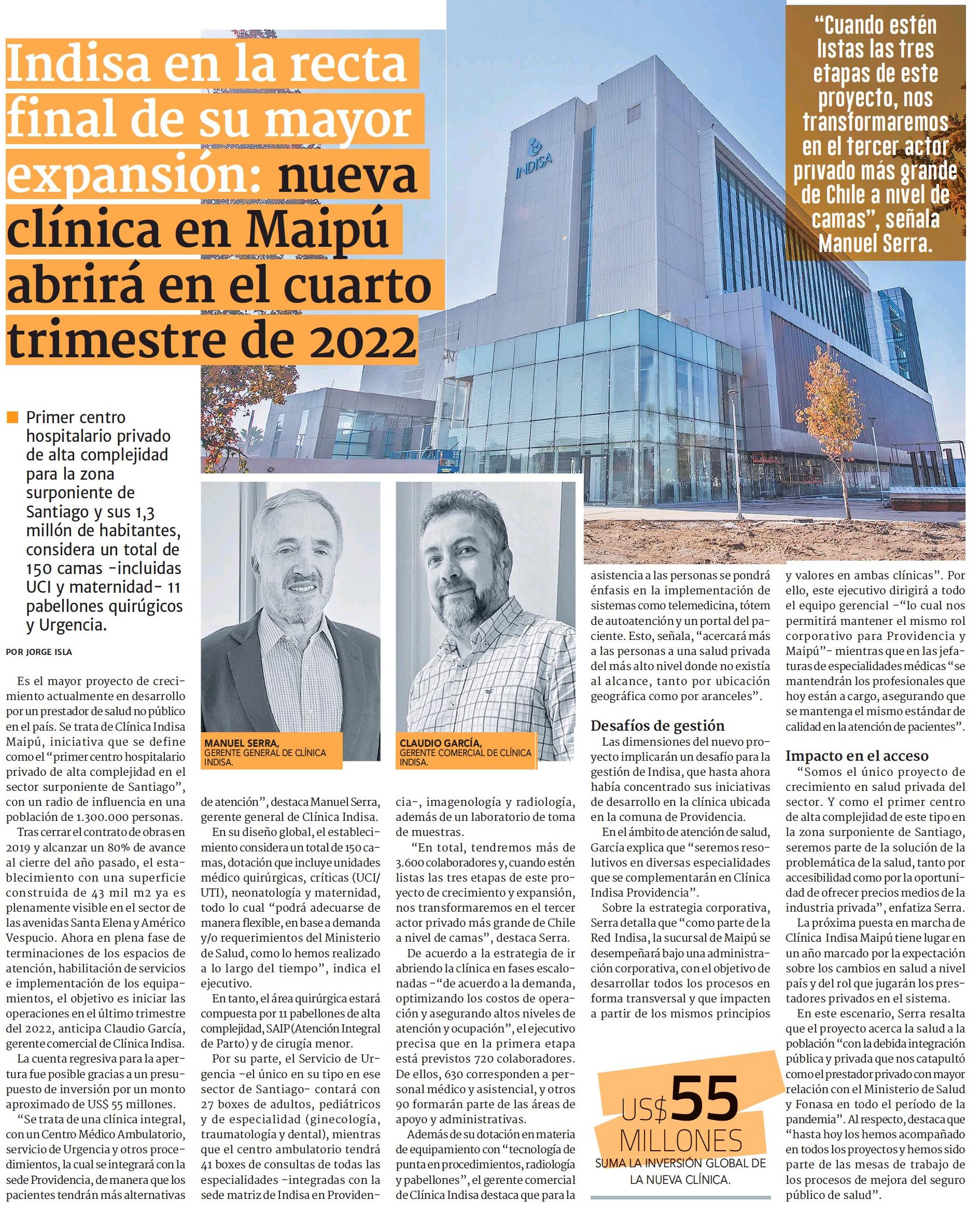 Indisa en la recta final de su mayor expansión: nueva clínica en Maipú abrirá en el cuarto trimestre de 2022 01-07-2022 Diario Financiero |