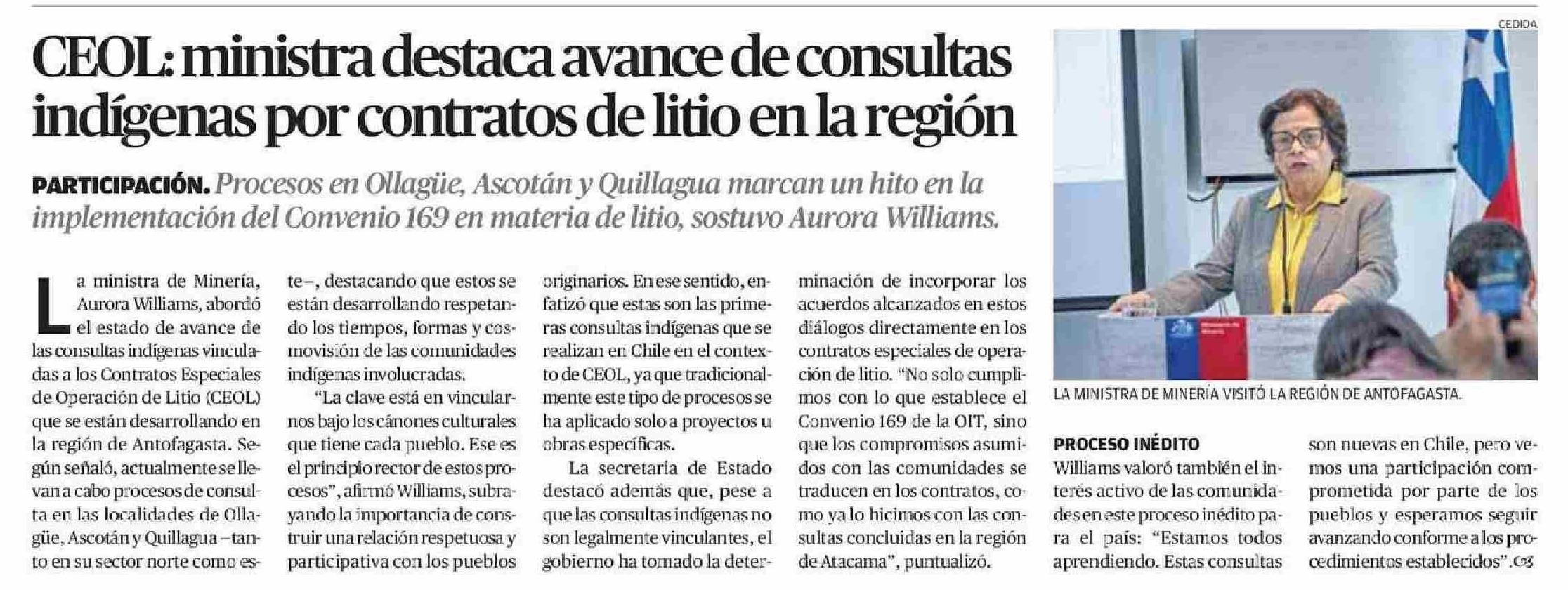 CEOL: ministra destaca avance de consultas indígenas por contratos de litio en la región 18-06-2025 El Mercurio de Calama |