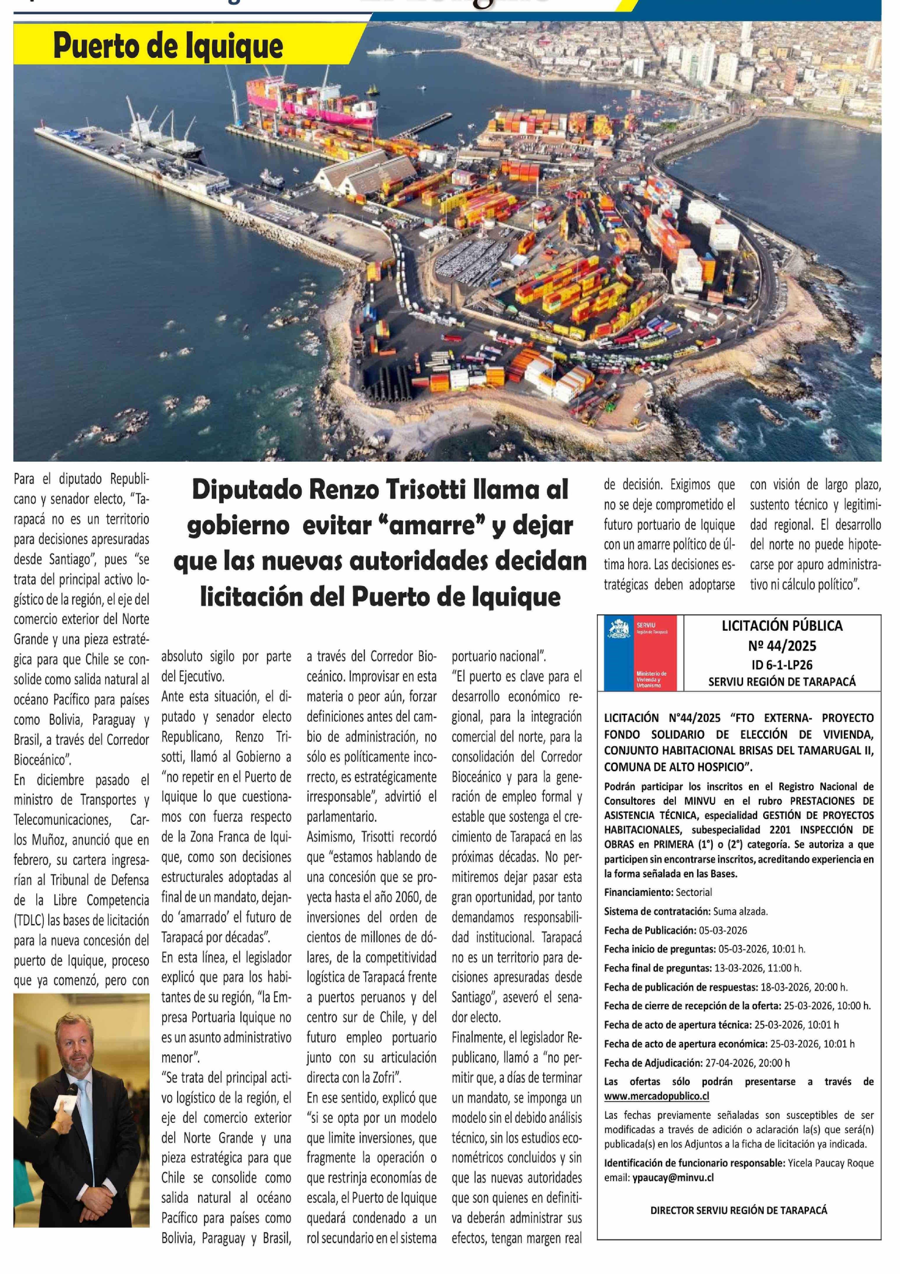 Título: Diputado Renzo Trisotti llama al gobierno evitar "amarre" y dejar que las nuevas autoridades decidan licitación del Puerto de Iquique