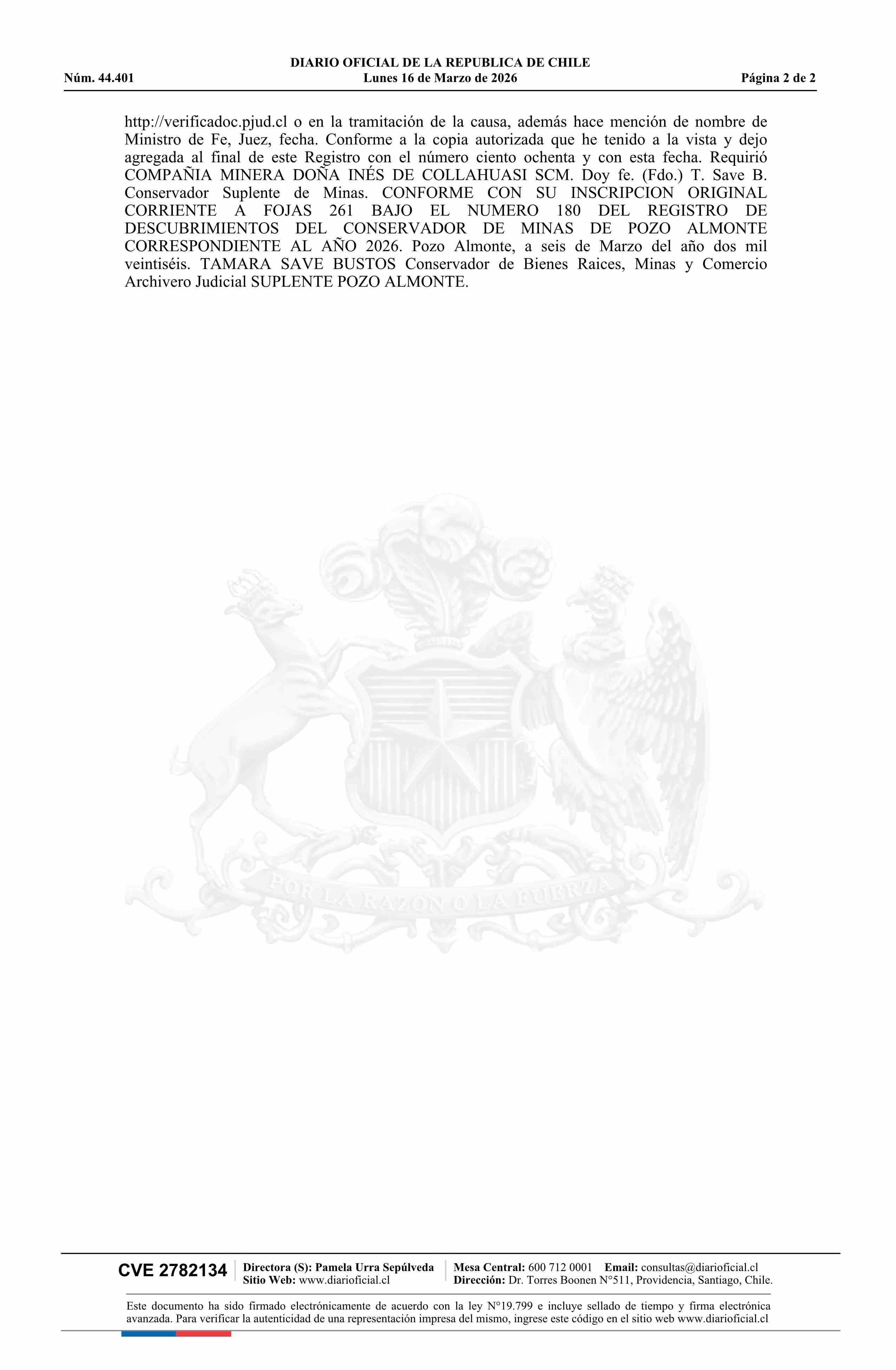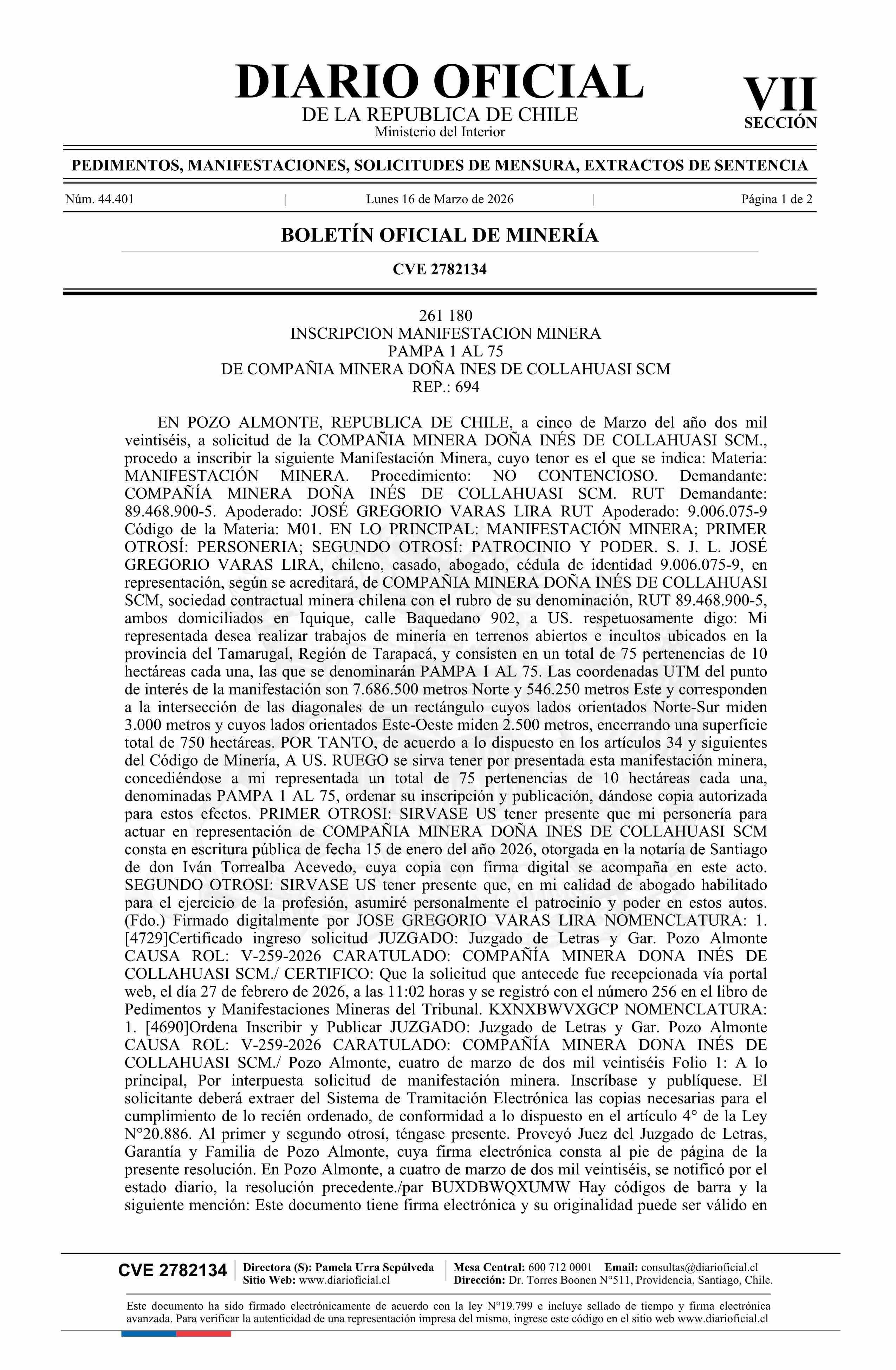 PAMPA 1 AL 75 / Compañía Minera Doña Inés de Collahuasi SCM 16-03-2026 DIARIO OFICIAL CHILE - BOLETÍN OFICIAL DE MINERÍA |