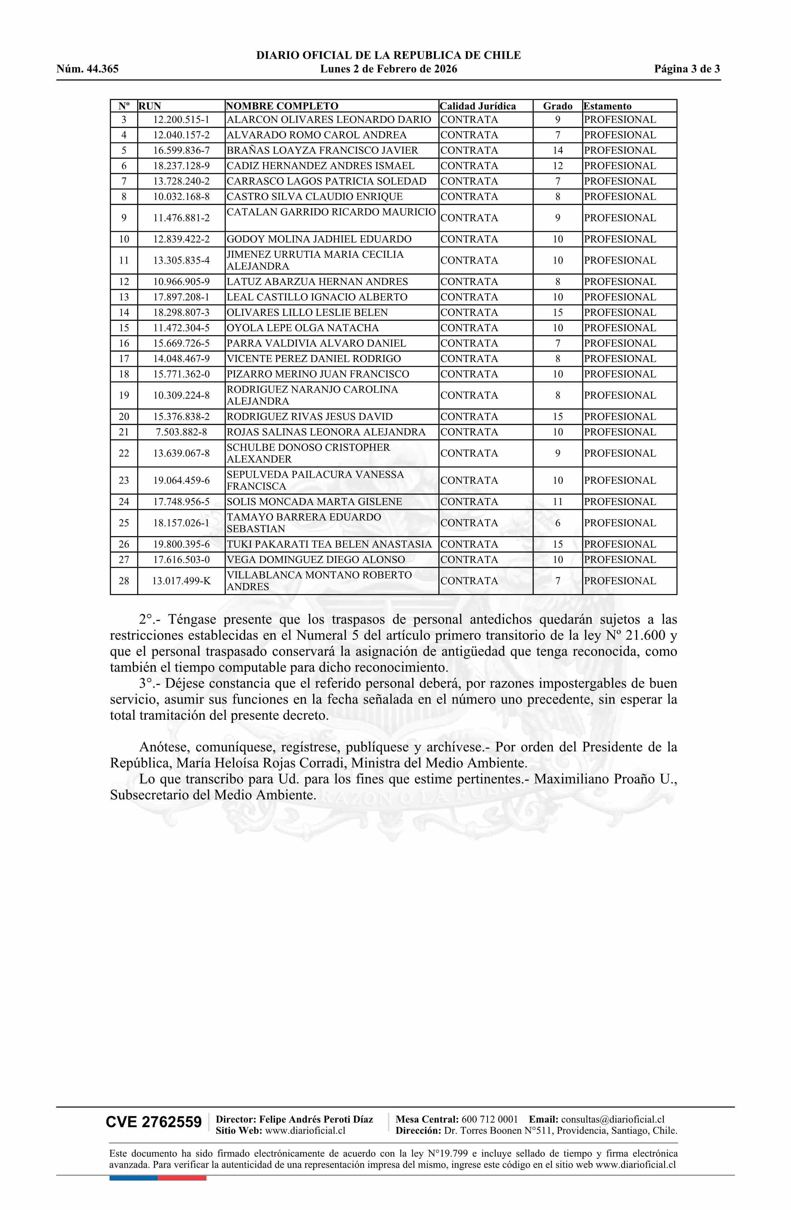 Decreto exento número 2, de 2026.- Ordena traspaso de personal de la Subsecretaría del Medio Ambiente al Servicio de Biodiversidad y Áreas Protegidas