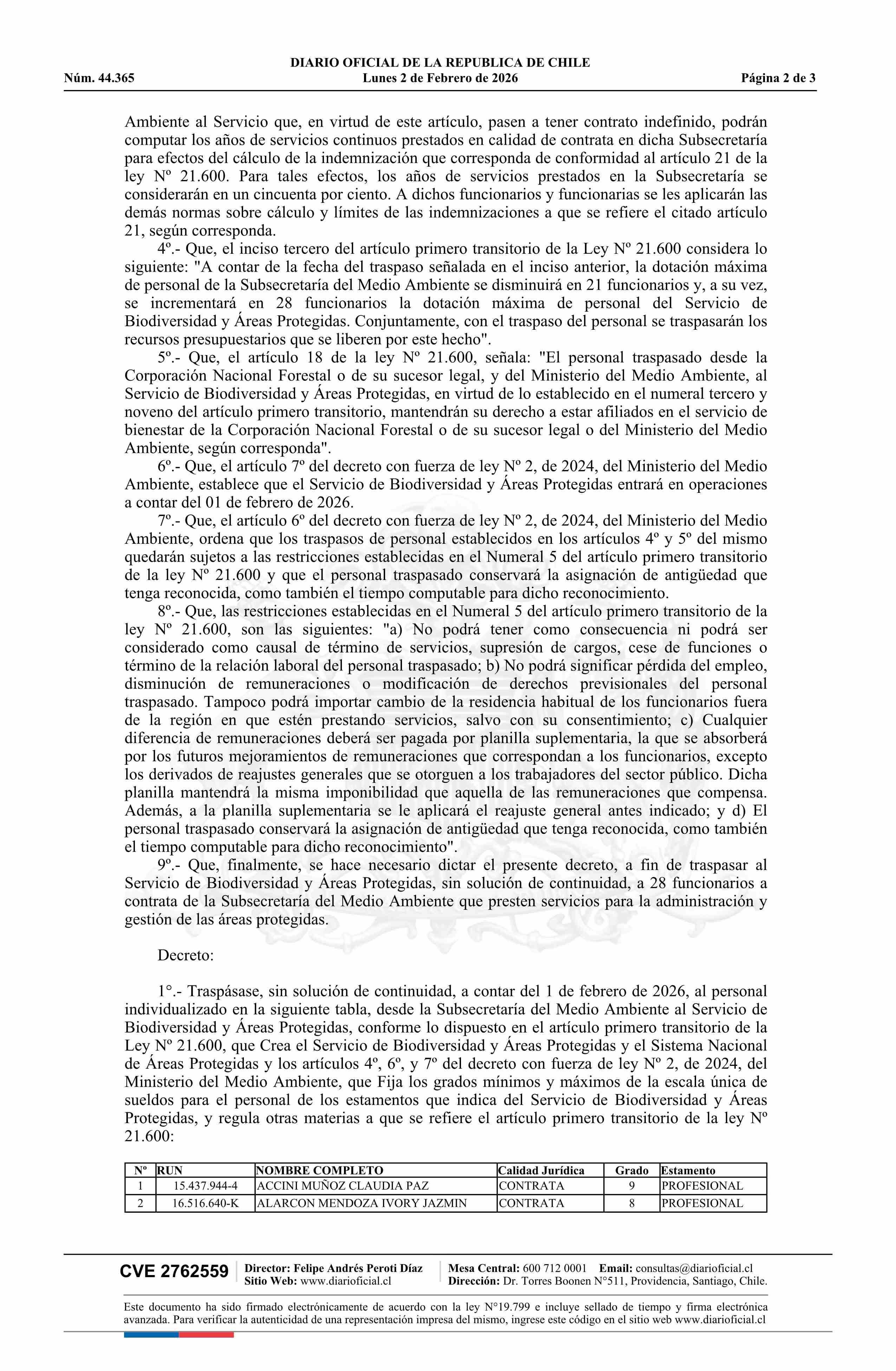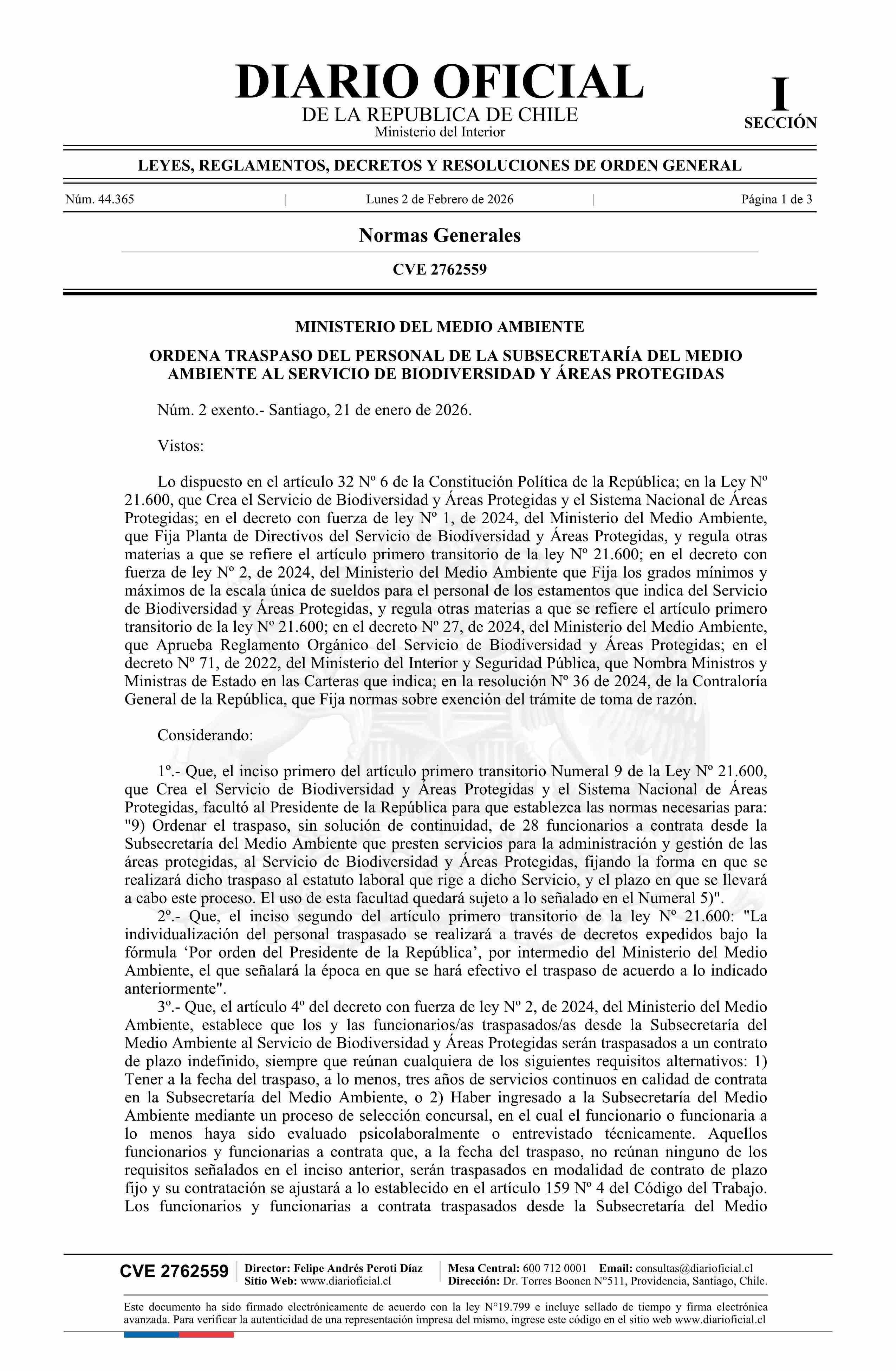 Título: Decreto exento número 2, de 2026.- Ordena traspaso de personal de la Subsecretaría del Medio Ambiente al Servicio de Biodiversidad y Áreas Protegidas