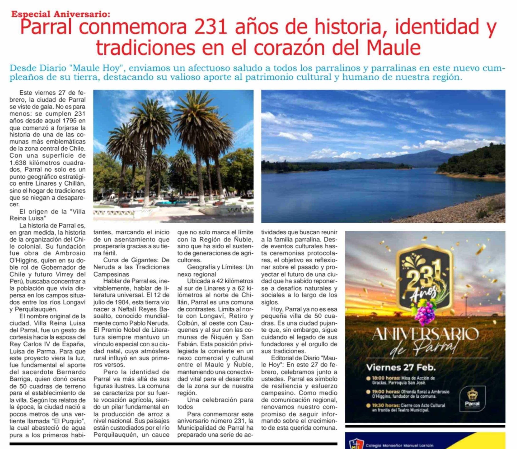 Título: Parral conmemora 231 años de historia, identidad y tradiciones en el corazón del Maule