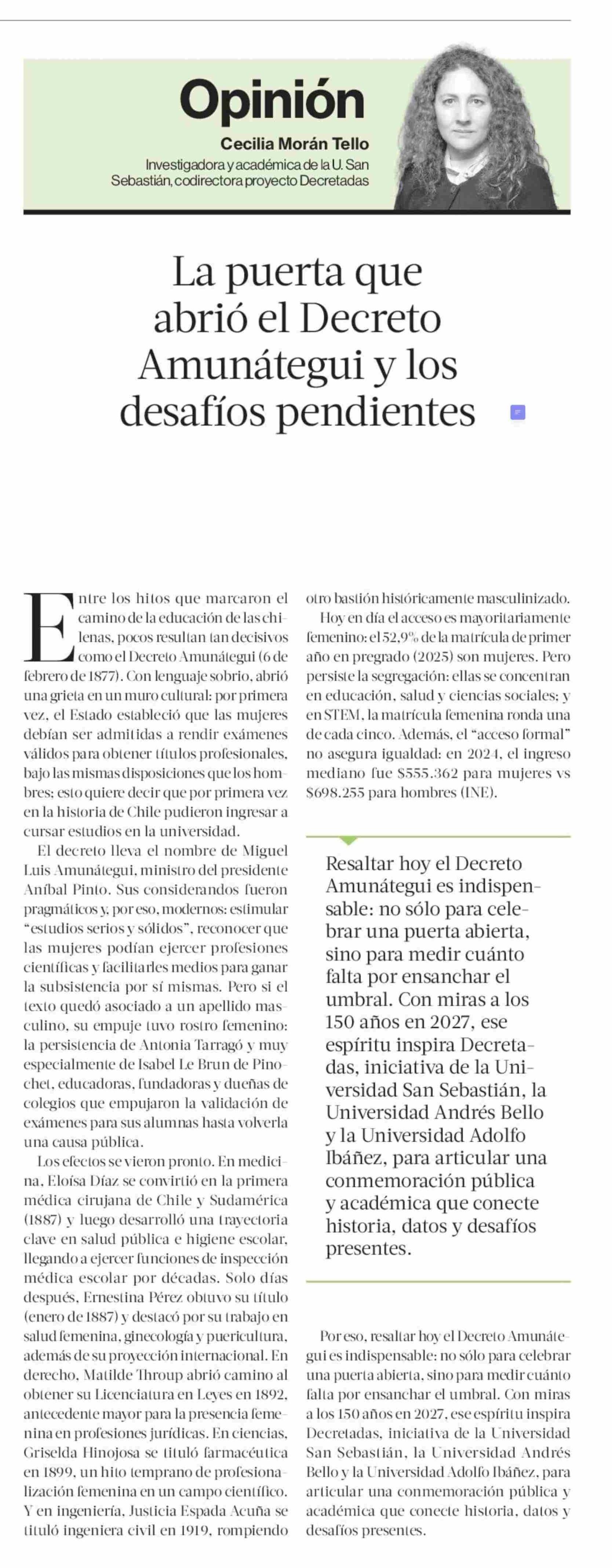 COLUMNAS DE OPINIÓN: La puerta que abrió el Decreto Amunátegui y los desafíos pendientes 26-04-2026 La Tercera |
